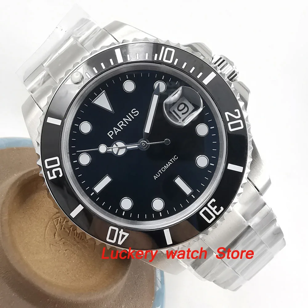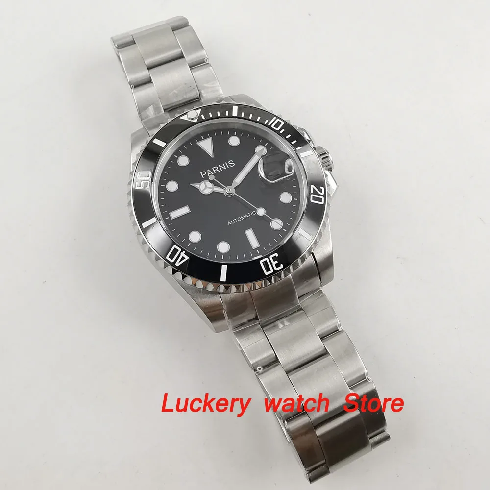 Механизм: автоматический (самонамоточный) механизм. Циферблат: черный циферблат; Светящиеся стрелки и отметки; Материал корпуса: твердый корпус из нержавеющей стали 316L. Водонепроницаемость 30 м. Размер Чехла: диаметр: 40 мм; Толщина: 14 мм. Ремешок: ремешок из нержавеющей стали шириной 20 мм. Тип застежки: раскладная застежка из нержавеющей стали. Стекло: сапфировое стекло.