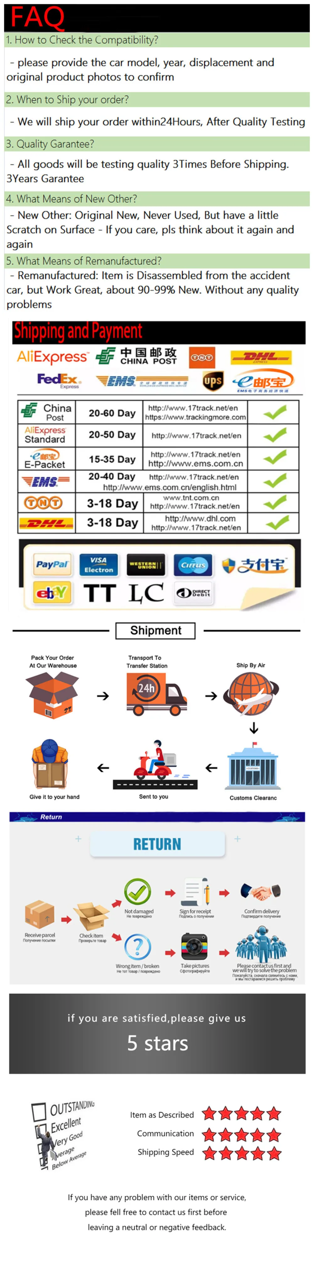 Чтобы избежать ненужных проблем между нами, пожалуйста, подтвердите, что товар подходит вашему автомобилю, когда вы покупаете! Если вы не уверены, пожалуйста, сообщите мне номер детали или отправьте мне несколько фотографий, согласно Aliexpress правилам, если клиенты покупают не тот товар, клиенты должны вернуть товар обратно и оплатить стоимость доставки для обратной и повторной отправки, спасибо!