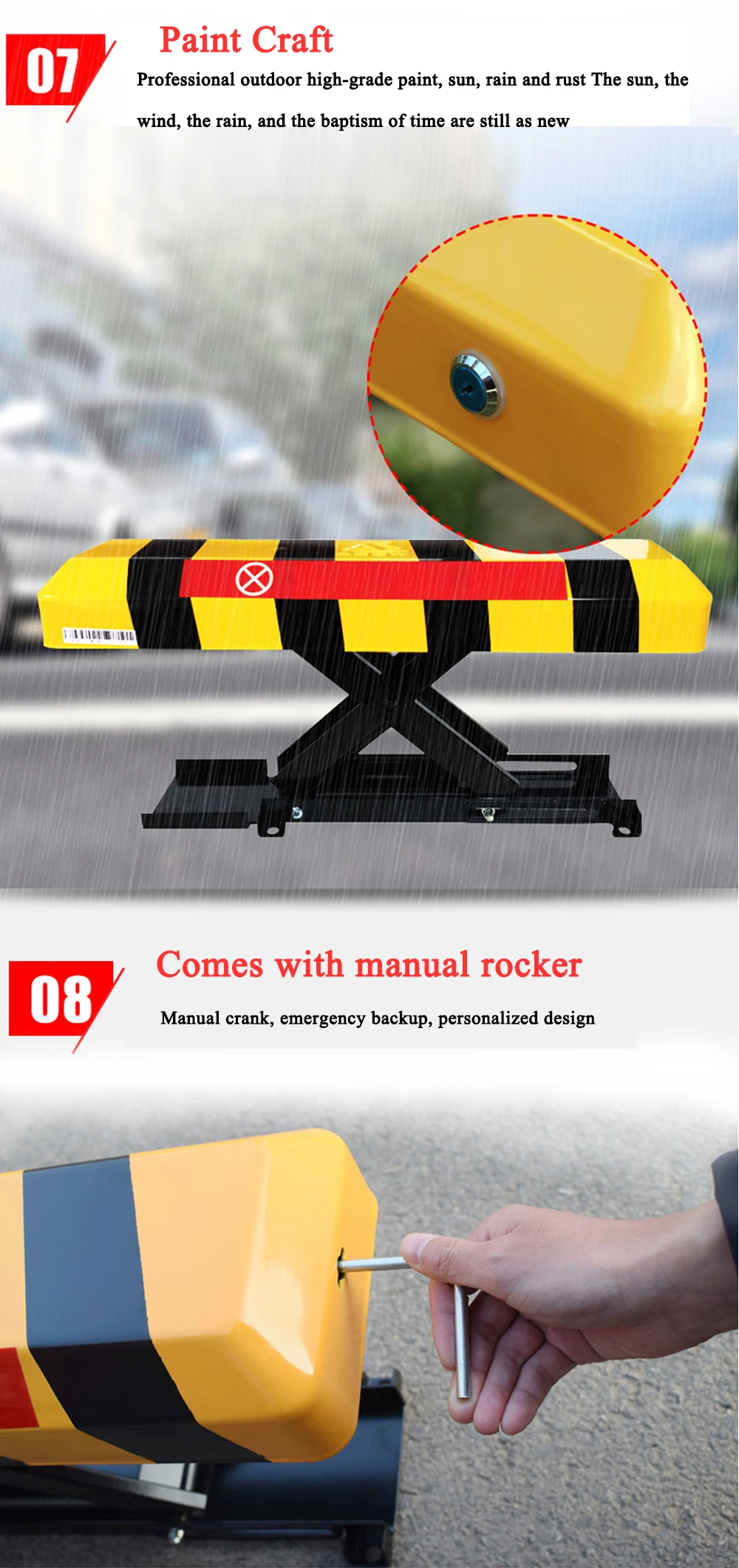 1. Модный дизайн: окрашенная поверхность, гладкая отделка; Рука в подъемном положении может быть 305 мм; 2. Сигнал тревоги для несанкционированной работы или внешней силы, пытающейся положить руку вниз; 3. Водонепроницаемость: парковочный барьер хорошо погружается в воду; 4. Анти-пилферинг: установка болтов внутри делает это невозможным; 5. Анти-давление: Чехол изготовлен из стали 3 мм и прочный; 6. Мощность Индикатор состояния: в тех случаях, когда ток в режиме ожидания составляет менее 4,5 V, раздастся звуковой сигнал.