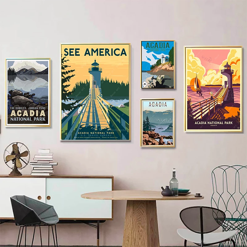 Американский национальный парк Акадия, винтажный дорожный плакат, холст, картина, плакат из крафт-бумаги, наклейка на стену, украшение для дома, подарок