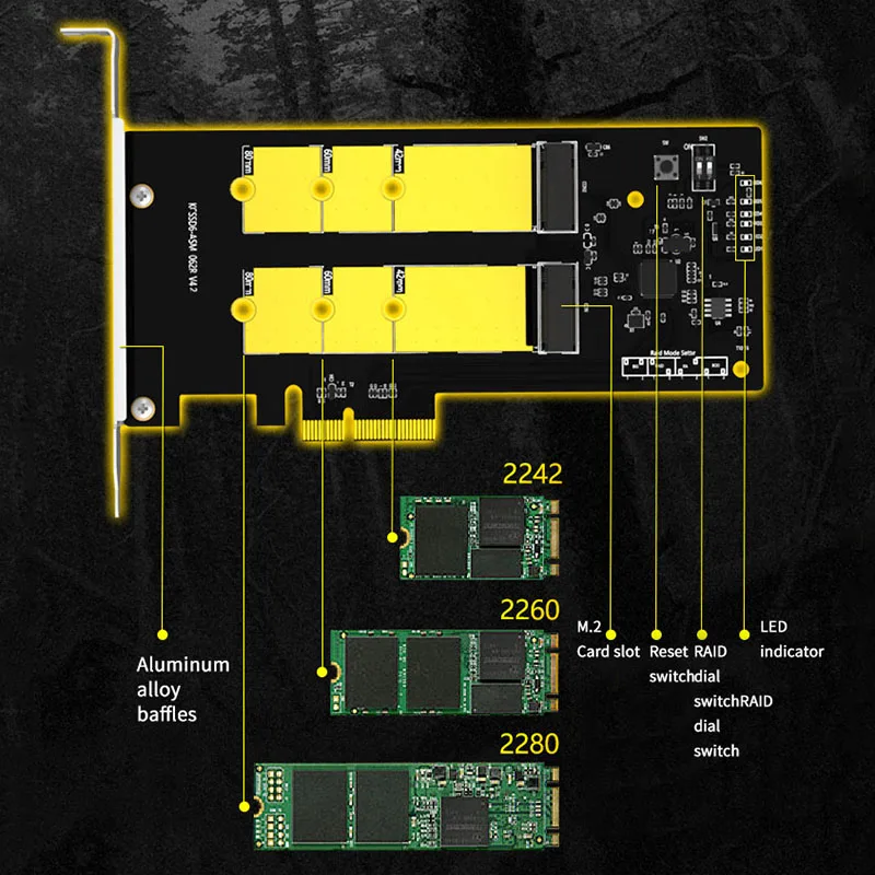 Поддержка PCIe X4, Совместимость с слотом для материнской платы X8/X16, поддержка трех размеров интерфейса PCIe. Поддержка жесткого диска s с тремя размерами 2240/2262/2280, SATA протокол M.2