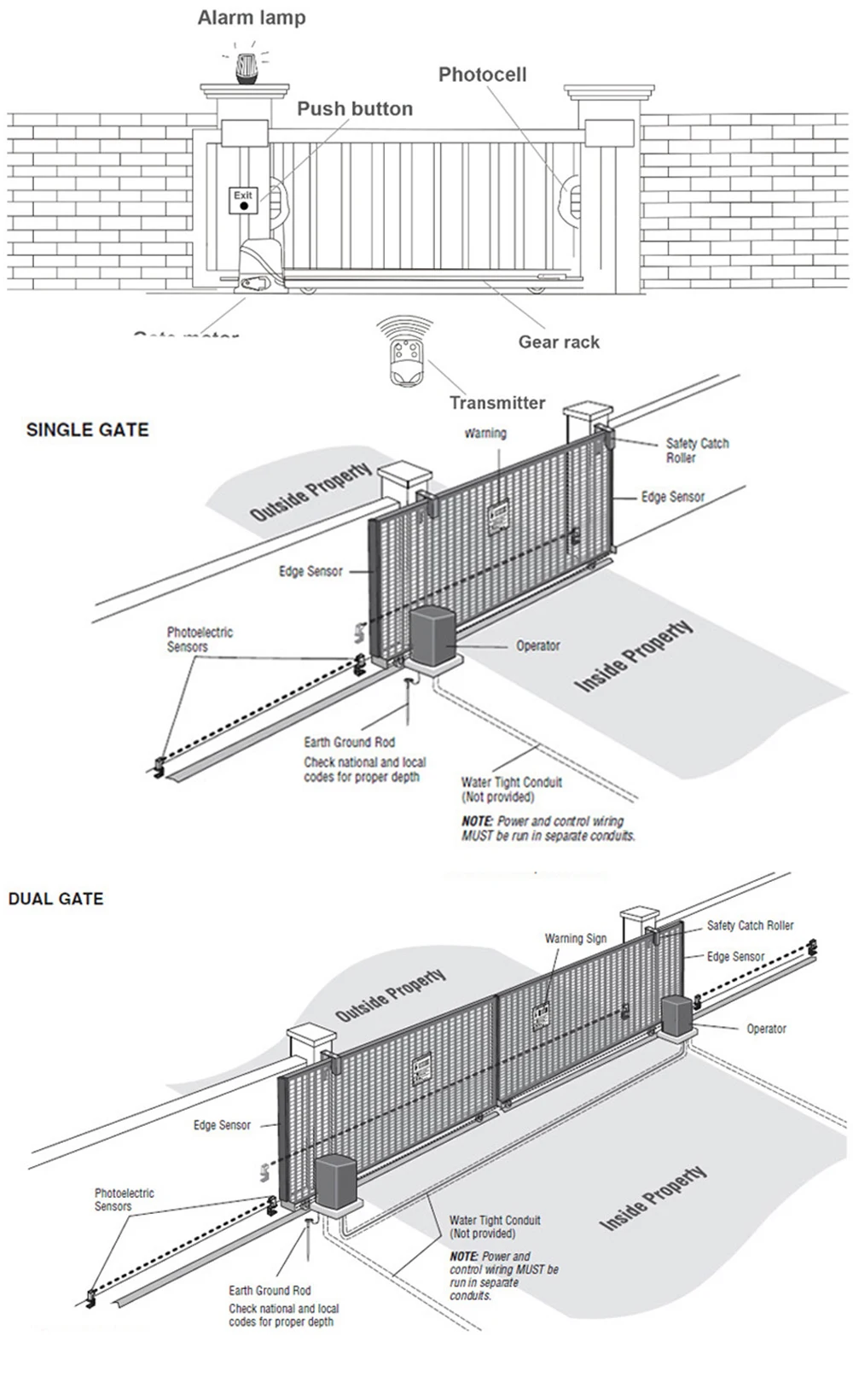 1. Полностью интегрированная электрическая механическая система (количество стеллажей опционально). 2. Интерфейс платы управления для дополнительных ударопрочных инфракрасных фотоэлементов. 3. Можно подключить мигающий светильник, клавиатуру и электрический замок и так далее. 4. Автоматическое Отложенное закрытие. 5. Регулируемая чувствительность сопротивления. 6. Автоматическая остановка ворот и повторное открытие при возникновении препятствий. 7. Беспроводной пульт дистанционного управления или проводной пульт дистанционного управления являются дополнительными. 8. 24 В постоянного тока раздвижные ворота открывалка может подключить трансформатор и резервную батарею.