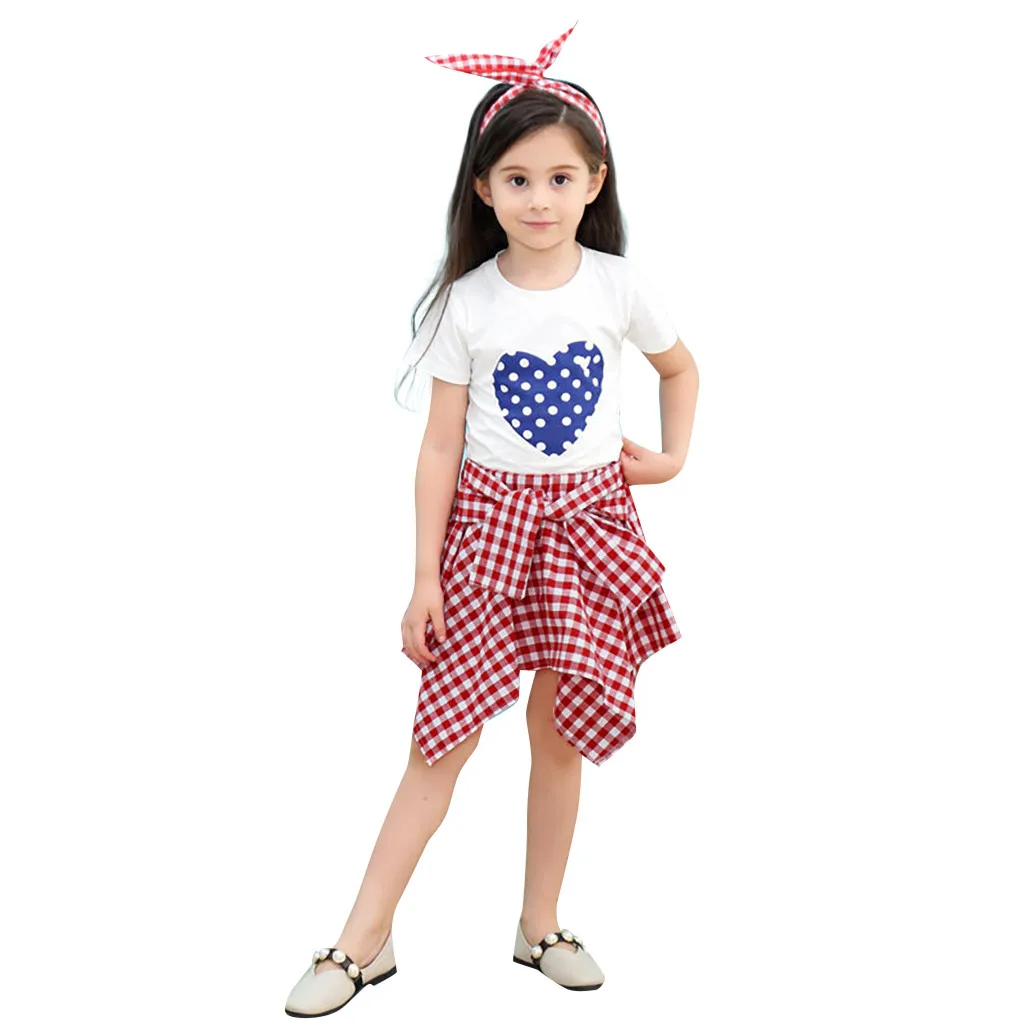 Футболка в горошек с короткими рукавами и надписью «Love» для маленьких девочек топы + клетчатые юбки, комплекты детская одежда для девочек, vetement enfant fille