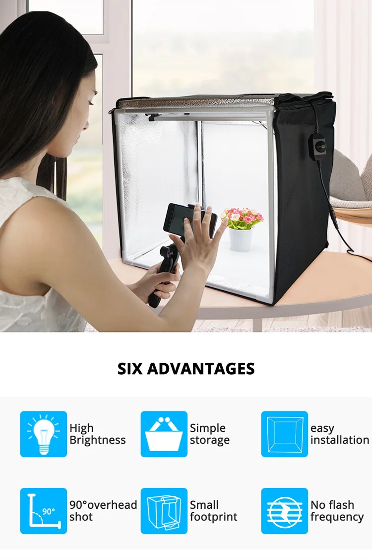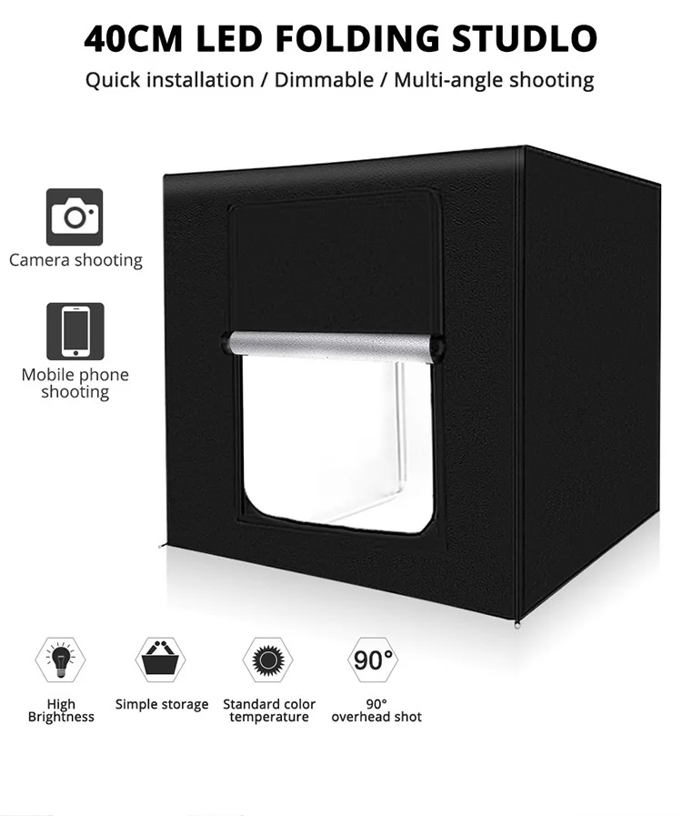 40 см * 40 см * 40 см светодиодный светильник коробка. Шесть преимуществ: 1. Высокая яркость 2. Легко носить с собой. 3. Простая установка. 4,90 ° над головой. 5. Небольшой размер. 6. Нет частоты вспышки.