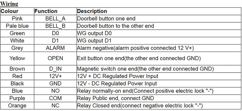 Проводные соединения: электрический замок, кнопка выхода, внешняя сигнализация, внешний считыватель