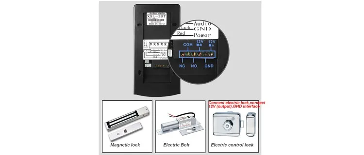 Может быть подключен к электрическому замку управления, электрическому болту, магнитному замку. (Примечание: При подключении электрического болта и магнитного замка он должен использоваться с источник питания с контролем доступа)