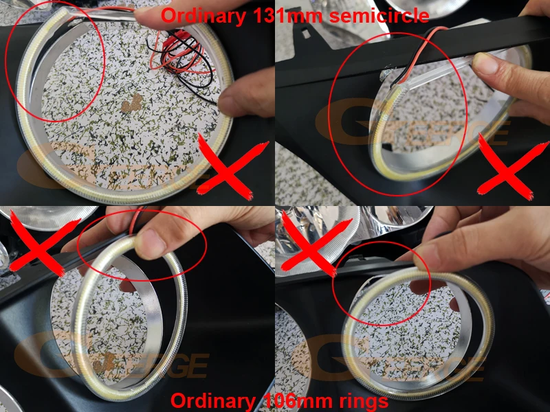 Важно: это COB LED halo кольца отличаются от других брендов angel eyes. Это автомобильные кольца для стайлинга. Не нужно резать рассеиватель, объектив и пластик внутри фары. Фабрика Geerge angel eyes проводила идеальную установку, насколько это возможно, не уничтожая внутреннюю структуру фар. Это невозможно для других брендов товаров.