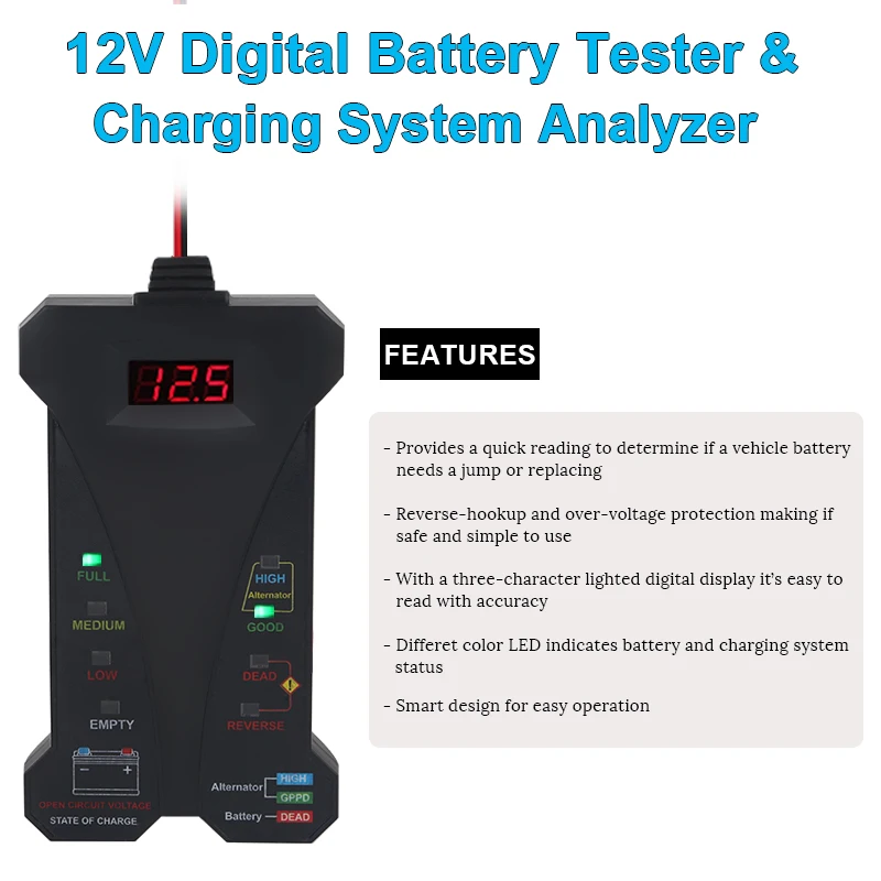 С цифровым дисплеем с 3 символами, этот тестер напряжения батареи легко читается с точностью.