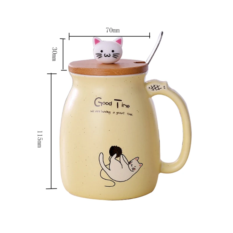 1. Креативный дизайн: Восхитительный рисунок кота, напечатанный на кружке, поставляется с милой и креативной деревянной губой. Яркая форма головы кошки, удобнее брать.