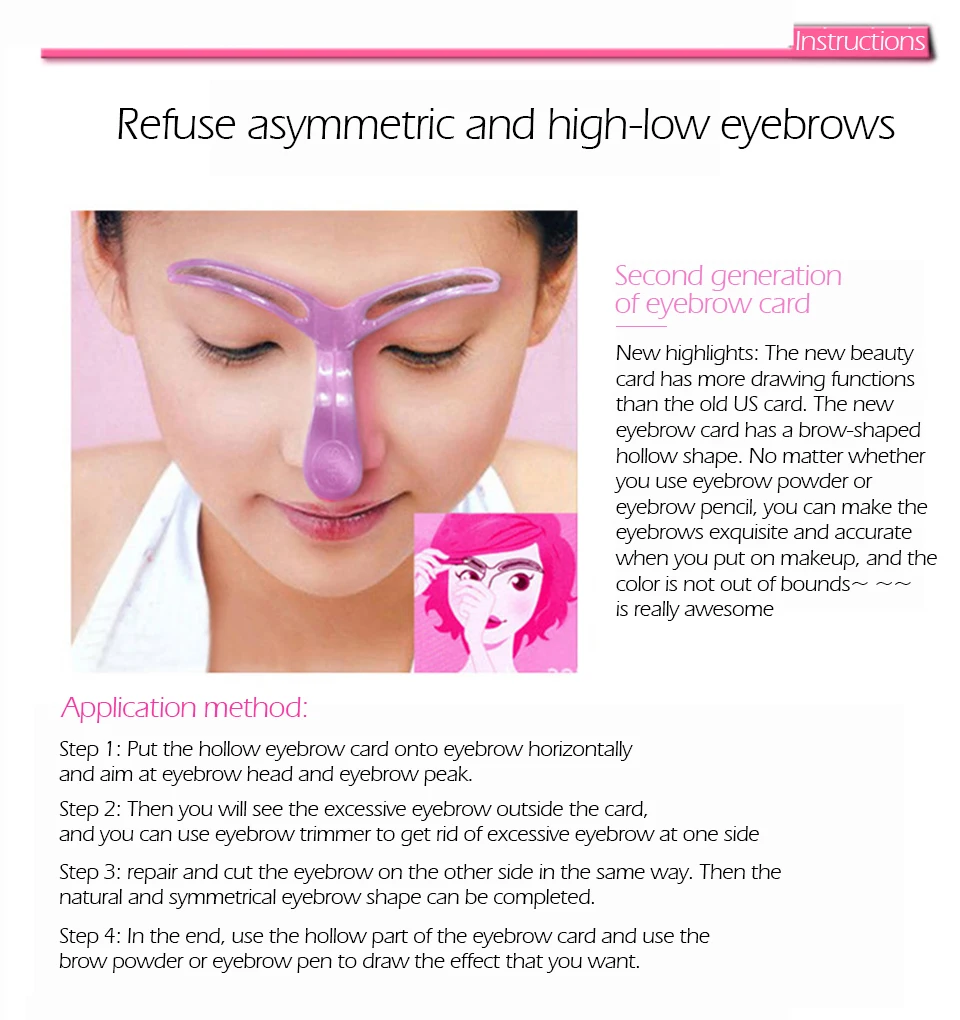 Откажитесь от асимметричных и высоких и низких бровей Второе поколение карт для бровей Новинка подчеркивает, что новая карточка для бровей имеет больше функций рисования, чем старая карточка для бровей. Новая карточка для бровей имеет полую форму в форме бровей. Если вы используете пудру для бровей или карандаш для бровей, брови могут быть изысканными и точными, а цвет не выходит за рамки. Способ применения Шаг 1: Поместите полую карточку для бровей на брови горизонтально и направьте на головку бровей и пик бровей. Шаг 2: Затем вы увидите чрезмерную бровь за пределами карты, и вы можете использовать триммер для бровей, чтобы избавиться от чрезмерной бровей с одной стороны. Шаг 3: отремонтируйте и отрежьте брови с другой стороны таким же образом. Затем естественная и симметричная форма бровей может быть завершена. Шаг 4: в конце Используйте полую часть карты для бровей и используйте карандаш для бровей или бровей, чтобы нарисовать эффект, который вы хотите.