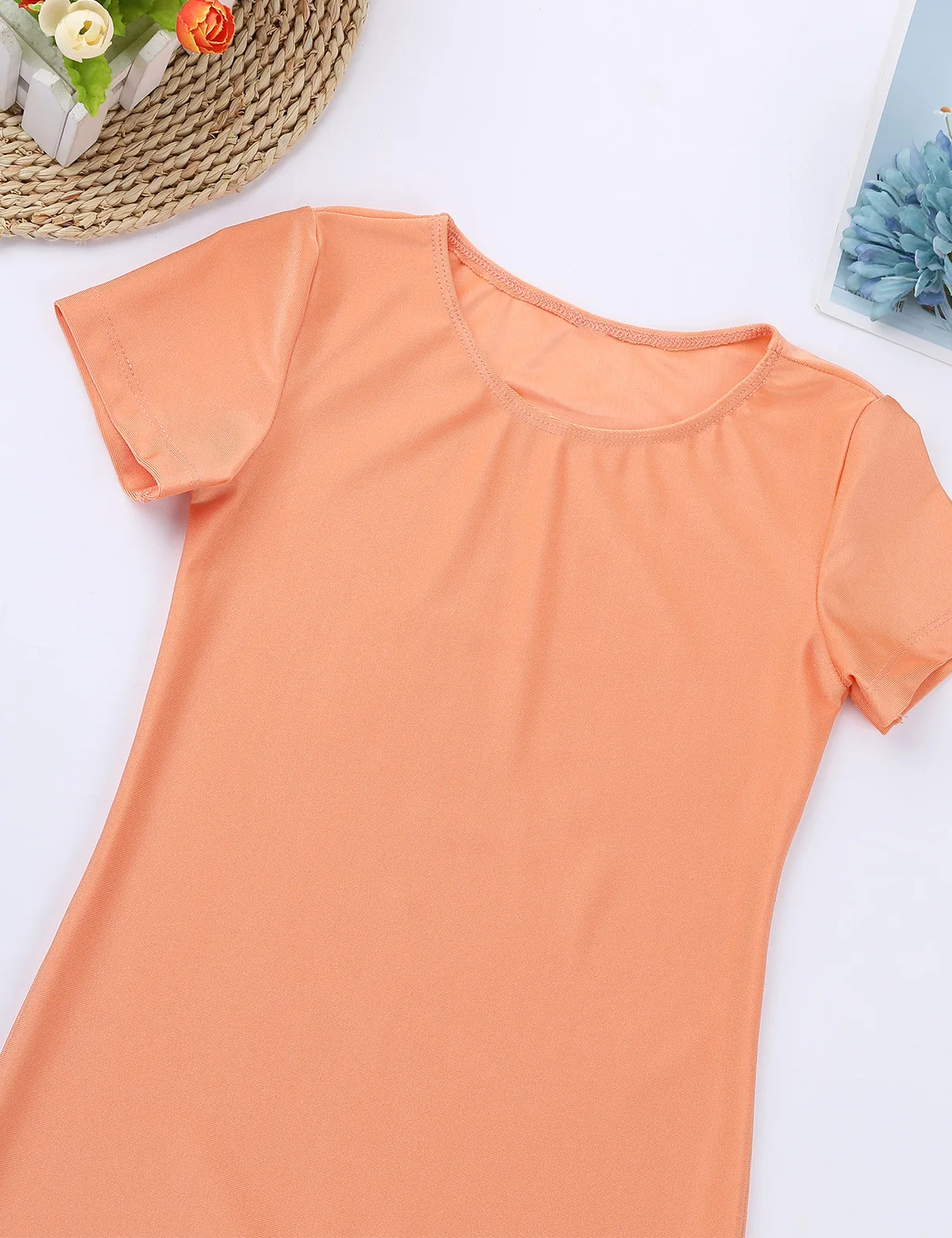 Комплект изготовлен из полиэстера и спандекса, ручная стирка. Таблица размеров означает возраст для детей, но они предназначены только для общего руководства. Короткие рукава, круглый вырез, однотонный дизайн. Приталенный крой, надежная застежка. Мягкая отделка, удобно носить. Легкая и эластичная ткань, отлично подходит для движения. Подходит для занятий танцами, гимнастическое упражнение, выступлений на сцене и т. Д.