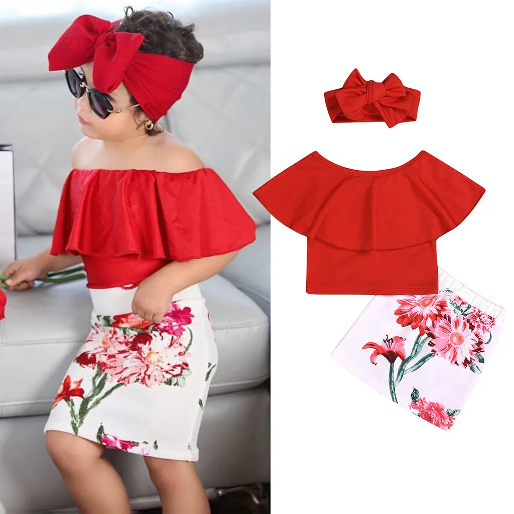 Комплекты одежды для маленьких девочек; рубашка с открытыми плечами; топ + юбка с цветочным принтом; комплект