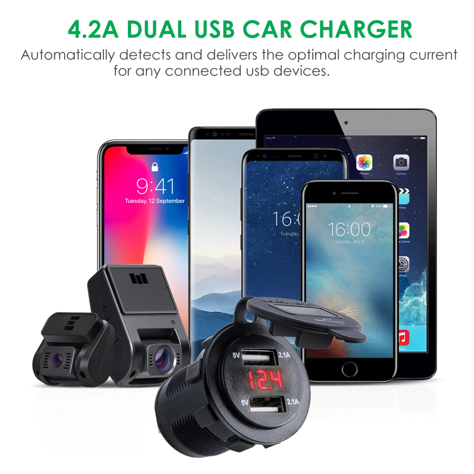 Особенности: 【Интеллектуальная зарядка с Умной зарядкой IC】: два usb-порта полностью для 4,2 А и каждого для 2,1 А, Будет автоматически обнаруживать ваши устройства и заряжать 2 устройства с оптимальной скоростью в то же время для максимальной эффективности зарядки. 【Встроенный светодиодный вольтметр для мониторинга здоровья батареи 】: реальный-своевременный мониторинг состояния вашего транспортного средства батареи и электрической системы, светодиодный Светящаяся цифра позволяет вам проверять данные ночью или в темноте. 【Защита от перезарядки для зарядки Провод, встроенный в 10А предохранитель для защиты от перегрузки, заряжает безопасно и без риска перегрева или повреждения устройств, Таким образом, сохраняя его в безопасности во время зарядки и продлевая срок службы устройства. Водонепроницаемость и Температурное сопротивление: водонепроницаемая крышка обеспечивает usb-порт и позволяет работать в условиях брызг, Отличный водонепроницаемый уровень IP66 поможет вам больше в фактическом использовании. Кроме того, Изготовлен из высокопрочного и низкотемпературного огнезащитного материала ПК, его прочный и сверхпрочный. 【Широкая Совместимость 】 это зарядное устройство USB гнездо подходит для DC 12-24V автомобиля, лодки, морской, мотоцикл, ATV, RV и т. Д. Подходит для Спецификация: Входная мощность: 12 В-24 В постоянного тока Выходная мощность: 5 В 2.1A/2.1A Материал: Поликарбонат Размер: 1,35 "x 2,05" Цвет: Синяя цифра | Красная цифра | Зеленая цифра Теплые советы: Показания напряжения могут быть видны только при подключении к батарее, а напряжение также может считываться, когда крышка включена Примечание: Возможны незначительные отклонения в размере на 1-3 см (0,4-1,18 ") измерения выполнены вручную, допускаются отклонения в размере в пределах и небольшое отличие в цвете может незначительно отличаться из-за разных настроек экрана Спасибо и хороший день! Посылка включает: 1 * Зарядное устройство USB с двумя портами 1*23,7 дюйма провод с предохранителем 10A