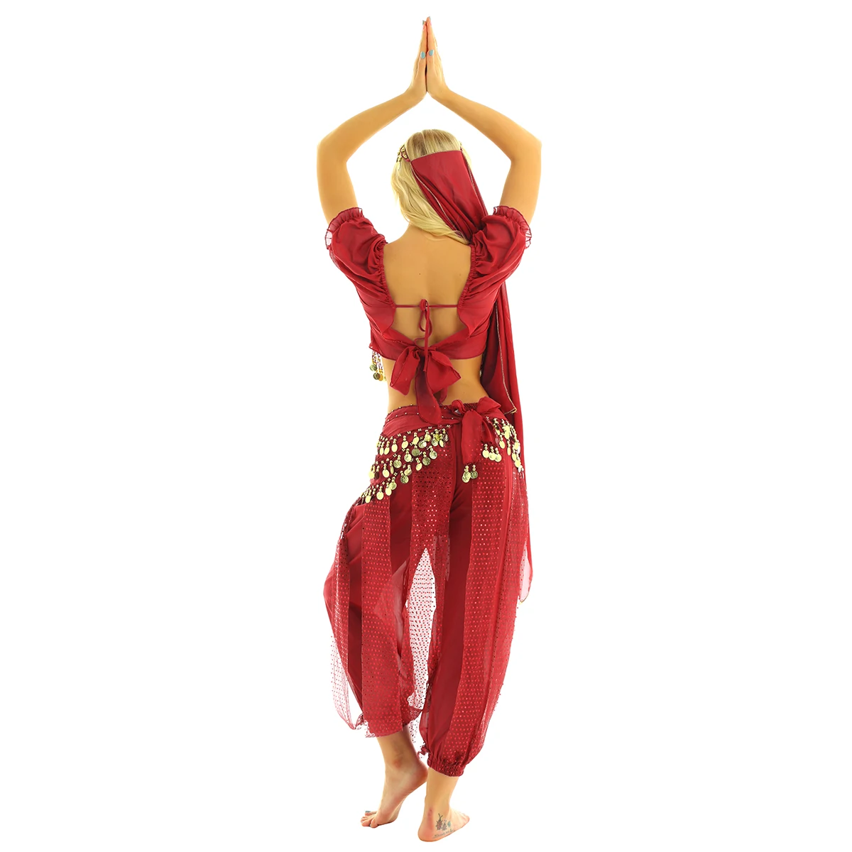 Топ с короткими рукавами, с пришитыми бусинами в виде колокольчиков и монет, дизайн с завязками на спине для более подходящего вам размера, брюки-шаровары с эластичным поясом и блестящим верхним слоем из тюля с блестками, растягивающиеся открытые ноги.