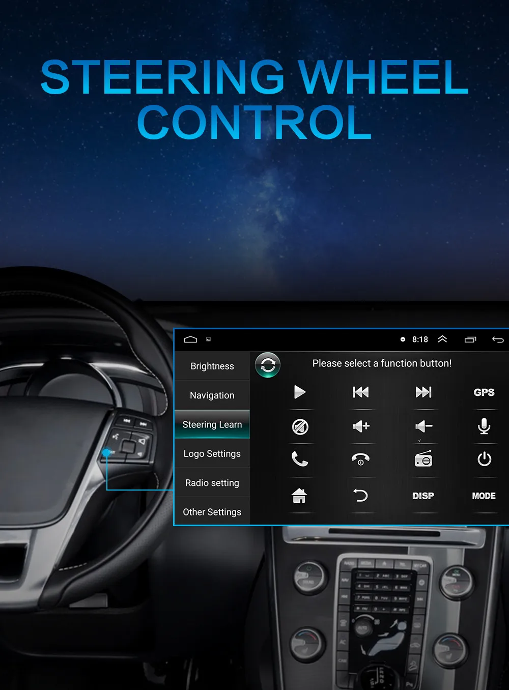Вы можете установить функцию управления рулем в проигрывателе Android, а затем управлять проигрывателем Android с помощью руля (Если автомобиль поддерживает функцию управления рулевым колесом)