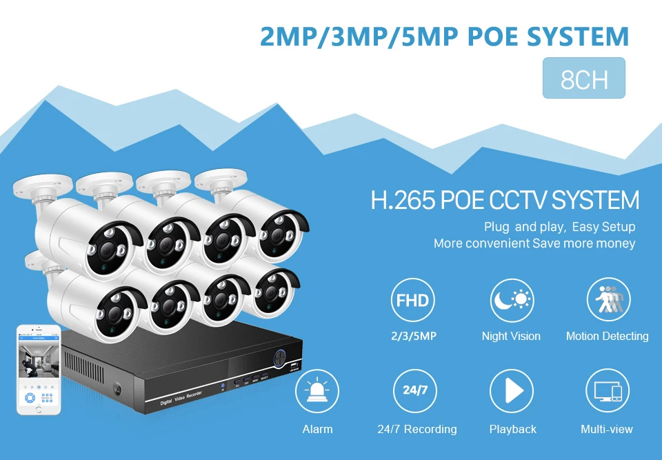 8 шт. 2MP/3MP/5MP камера + 8-канальный PoE NVR