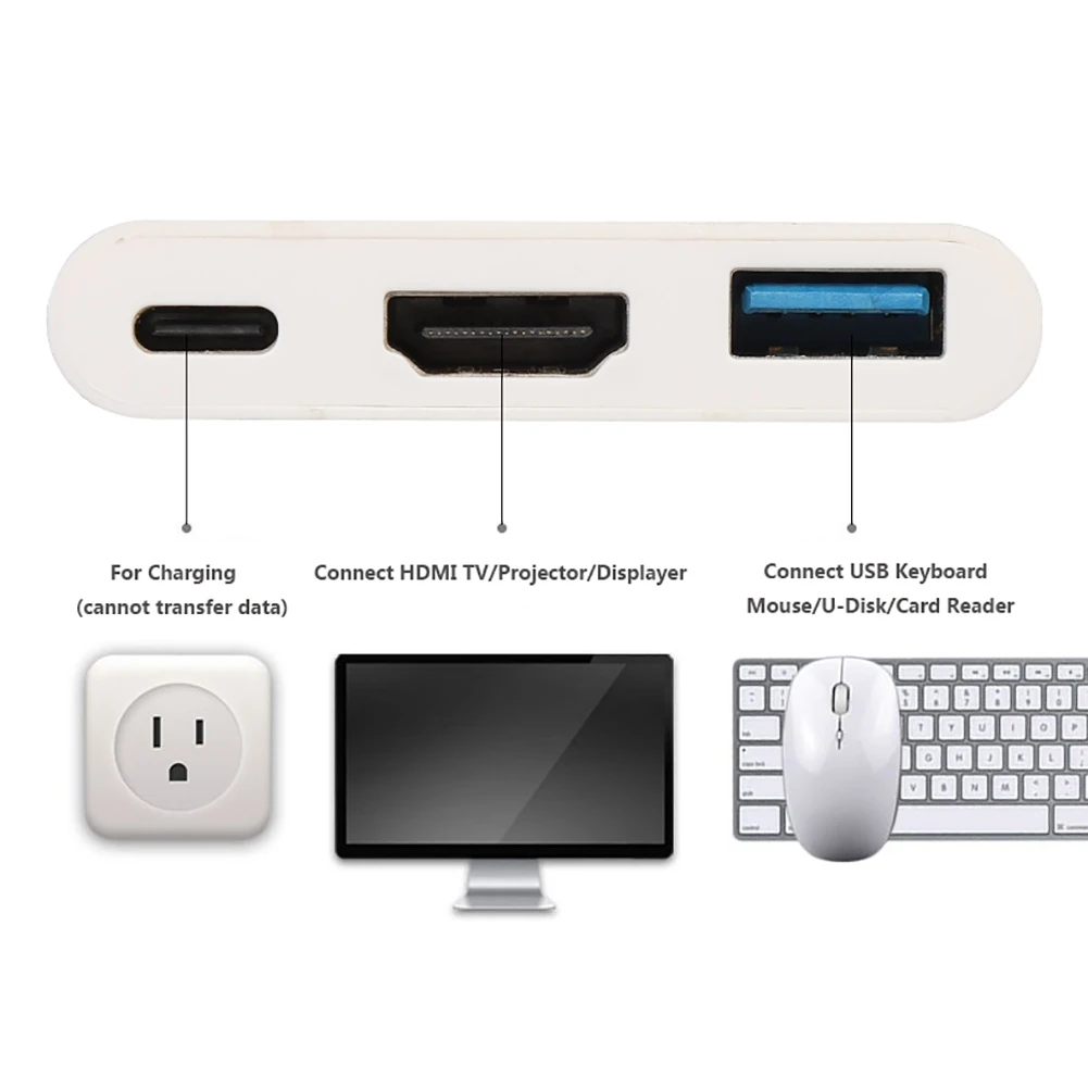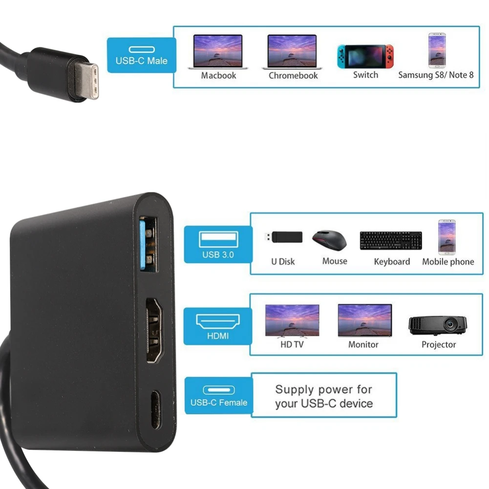Характеристика: 1. поддержка 4 K x 2 K HDMI --- портативный концентратор адаптера HDMI поддерживает разрешение видео до 3840X2160P, 30 Гц с совместимостью большинства мониторов, проекторов, HDTV и других устройств с портом HDMI 2. Выход USB 3,0 обеспечивает высокоскоростную передачу данных до 5 Гбит/с. Поддерживает максимальный ток 0.9A, обратная совместимость с USB2.0. 3. Функция USB PD (доставка питания) --- Type-C может заряжать ваши новые устройства (для 2016 Macbook, 2016 Macbook pro, для Google new Chromebook Pixel. Не беспокойтесь о нехватке электроэнергии. (Тип C/F не поддерживает передачу данных, только зарядка) 4. Конструкция корпуса ABS --- адаптер обеспечивает жесткость, лучшую теплоотдачу. Позолоченный порт типа C обеспечивает лучшую производительность сигнала. 5. подходит для Nintendo Switch, для 2016/17 MacBook Pro, для MacBook 12 "(2015), для Chrome Book Pixel, для Dell XPS 15, для Samsung Notebook 9, для HP EliteBook Folio G1 и многое другое. Также совместимы мышь, клавиатура, камера, u-диск, съемный жесткий диск, камера или другие устройства USB A 3,0/USB A 2,0. Спецификация: Цвет: черный, белый Тема: дома Тип: адаптер Материал: АБС-пластик Упаковка: сумка Примечание: Из-за разницы в экране цвет может немного отличаться от того, что вы ожидаете, пожалуйста, позвольте Упаковка включает: 1 х адаптер