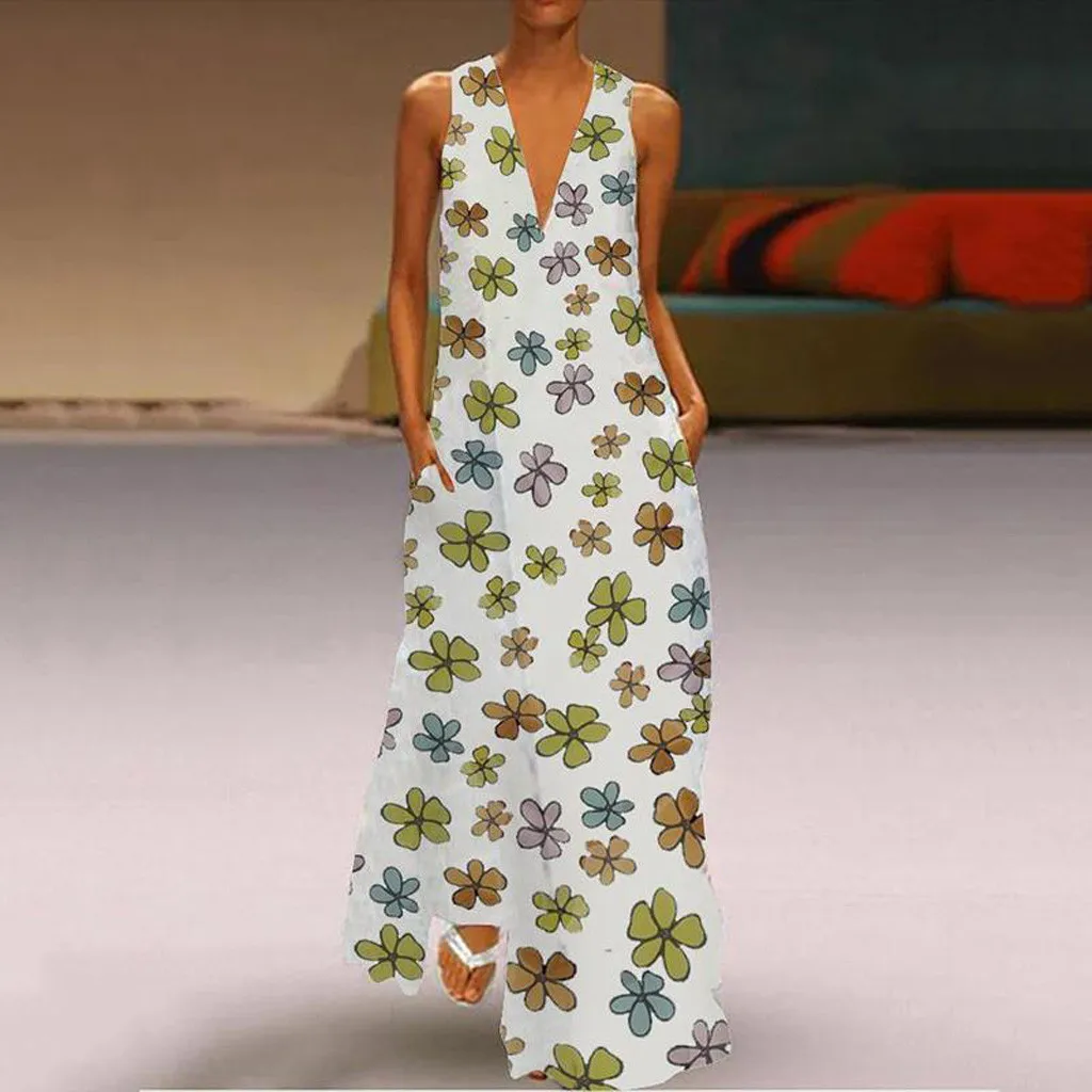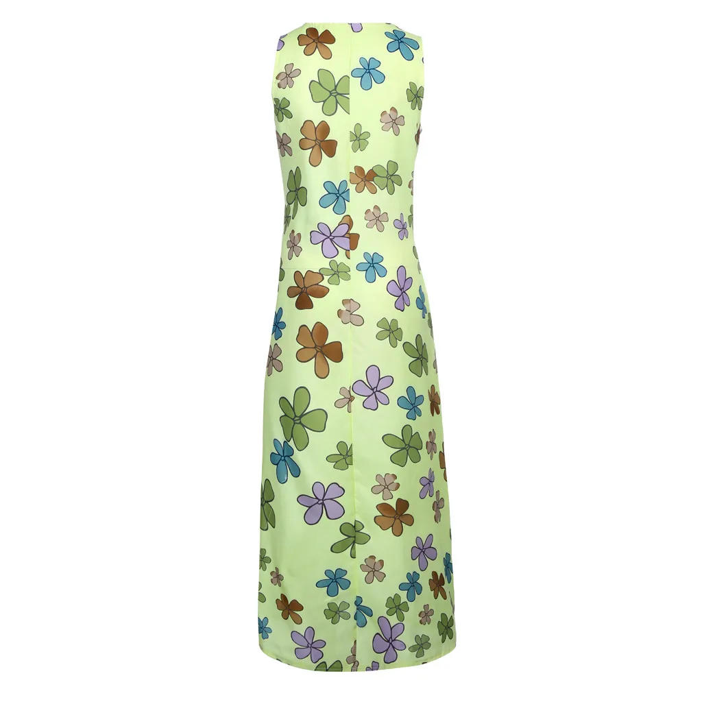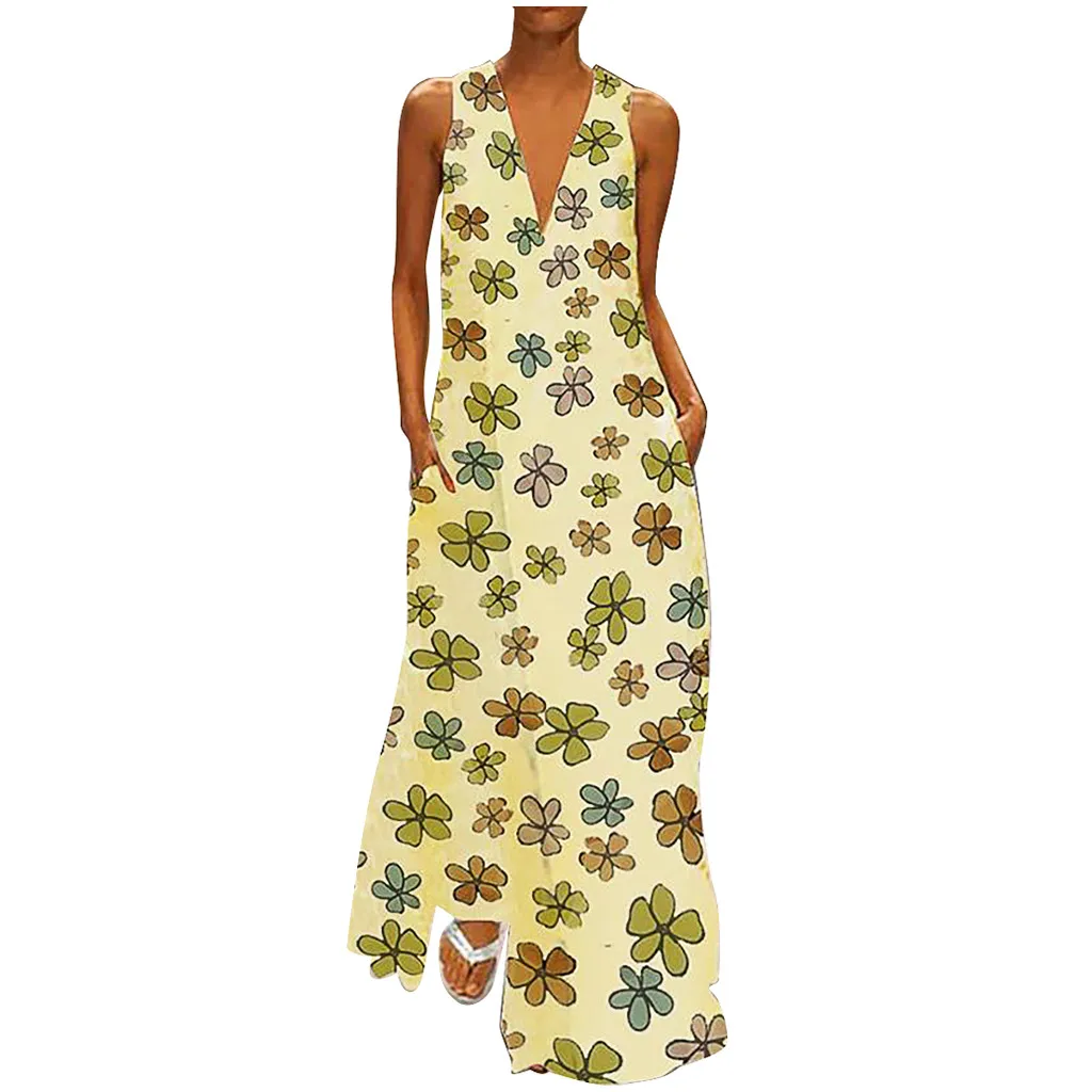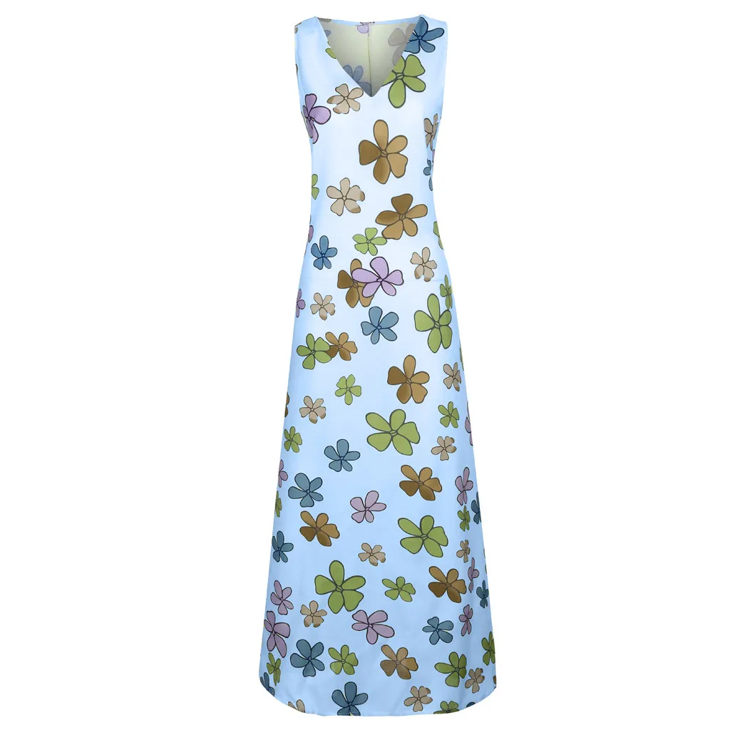 Модное женское цветочное печатное без рукавов с v-образным вырезом повседневное Макси платье