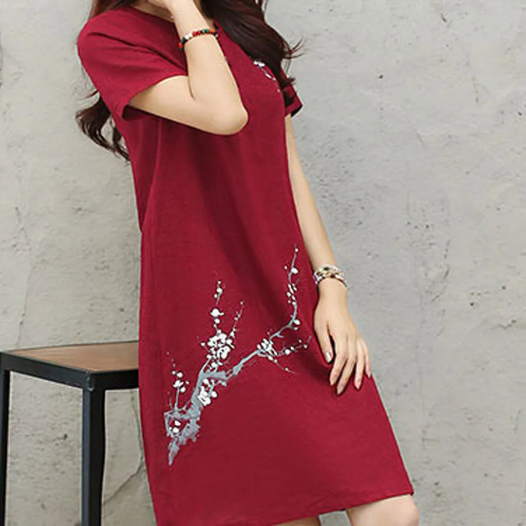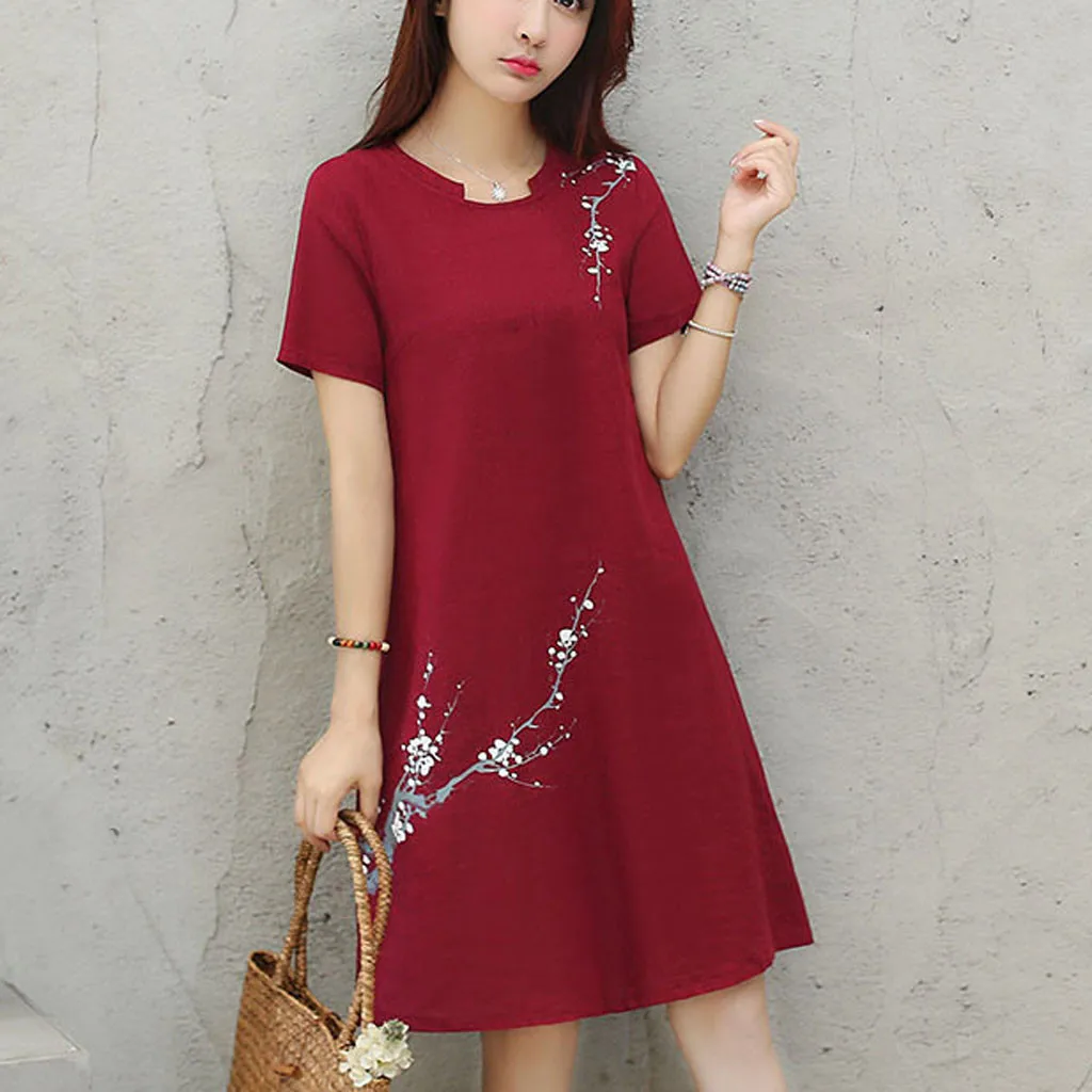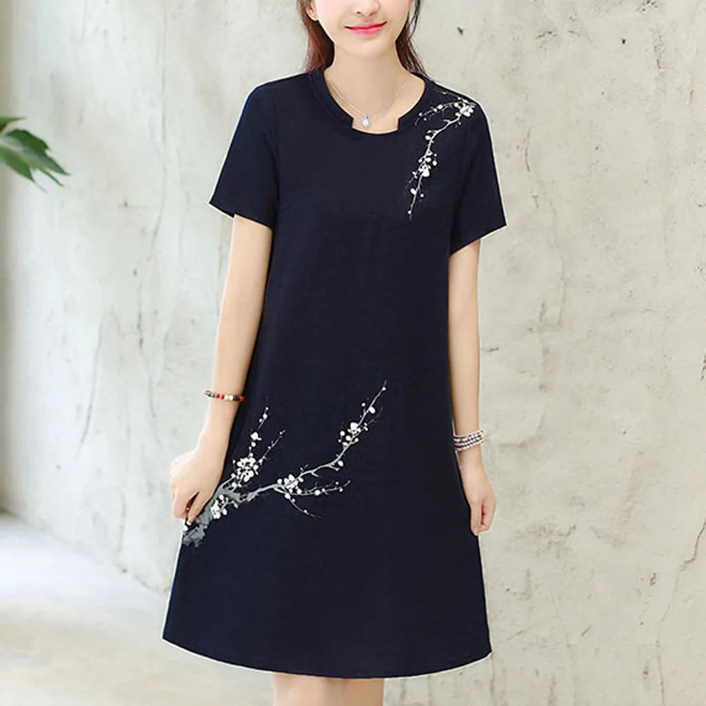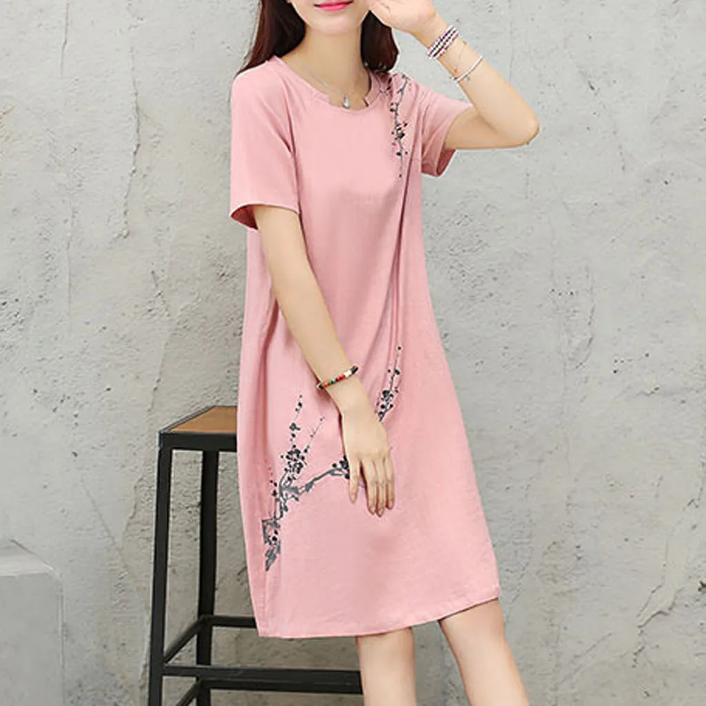Для женщин Винтажное Повседневное платье с цветочным принтом и круглым вырезом, с короткими рукавами, из хлопка и льна