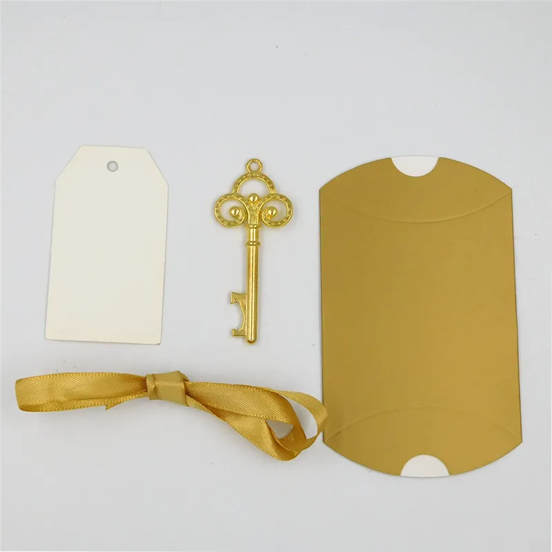 Материал: 250 г белый картон + цинковый сплав Вес: 750 г/50 комплектов Размеры: открывалка для бутылок 2,8x6,8 см подушка бант 11.5x7cm Цвет: золото. Серебристый Количество: 100 комплектов (100 шт. бантик для подушки + 100 шт. открывалка для бутылок + 100 шт. карточка для сообщений + 100 шт. лента) Использование: Эти вечерние подарочные пакеты элегантны и важны, изготовлены из золотой или Серебристая Подушка-коробка для конфет в сочетании с открывателями для бутылок в форме ключа, завязанными изящной лентой, а также белыми подарочными бирками. Этот уникальный подарок souvernir обязательно удивит ваших друзей и гостей. Показано на картинке
