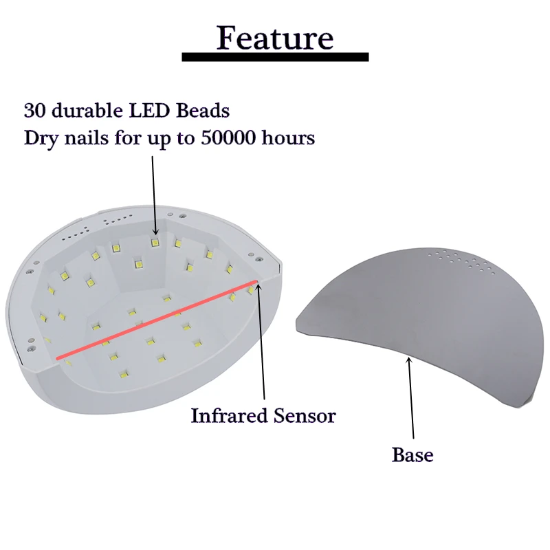 1. С двойным светом 365nm и 405nm, может быстро высушить лак для ногтей. 2. С функцией синхронизации, может быть рассчитан на 5, 30 и 60 секунд времени, сократить время сушки гелей. 3. Процесс сушки геля безболезненный, давая Вам комфортный опыт. 4. Легкий, легко носить с собой и хранить. 5. Продукт имеет большое пространство для использования, руки свободно доходят до него. 6. Светильник не повредит ваши глаза и не загорит ваши руки. 7. Доступен в ручном и автоматическом режимах, может быть выбран в соответствии с вашими требованиями.