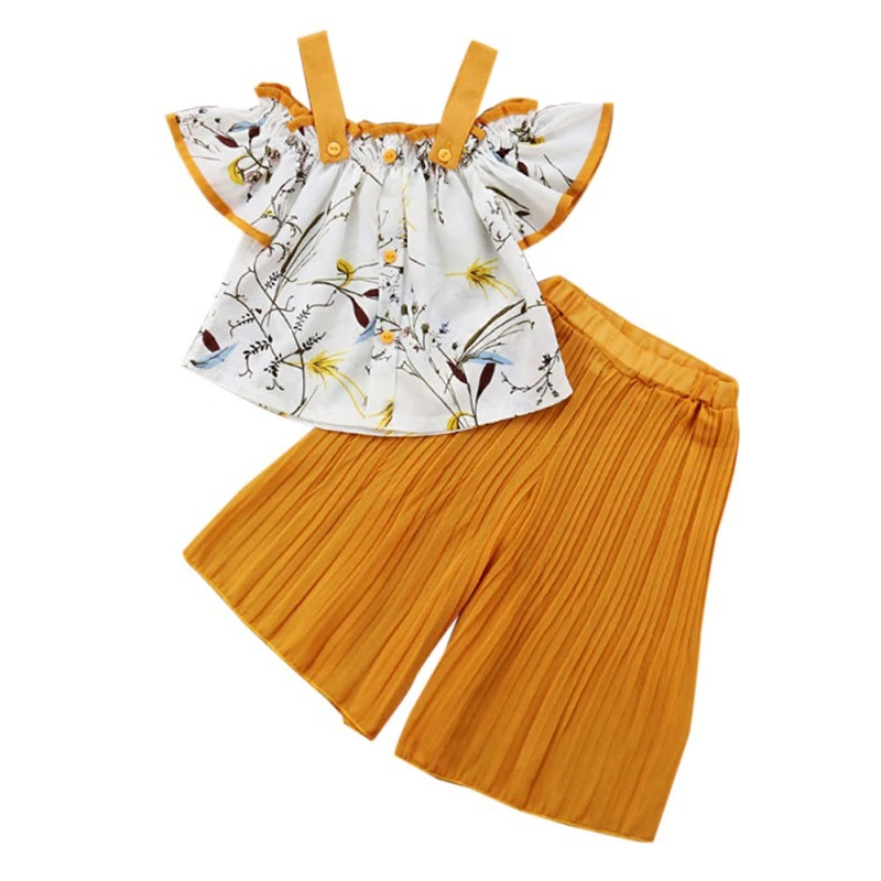 От 1 до 6 лет Детская футболка с цветочным принтом и открытыми плечами для маленьких девочек топы + широкие штаны с оборками, комплекты с брюками модная детская одежда