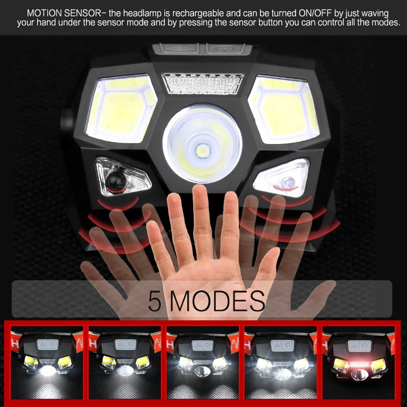 4. 5 режимов освещения-высокий светильник-низкий светильник-2 * COB высокий светильник-основная лампа + 2 * COB яркий-светодиодный красный светильник