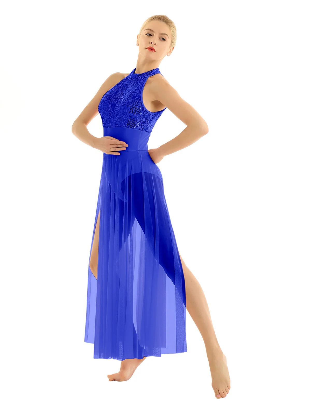 Женское платье для танцев без рукавов для взрослых, хорошая эластичная ткань. Вырез на шее с кнопками, лиф с блестками и подкладкой, вырез сзади. Встроенный купальник с разрезом на талии. Мягкая и гладкая ткань, удобная в носке. Подходит для лирического, бального, танцевального класса, соревнований, выступлений на сцене и т. д. Пожалуйста, проверьте информацию о размере перед покупкой, рекомендуется ручная стирка.