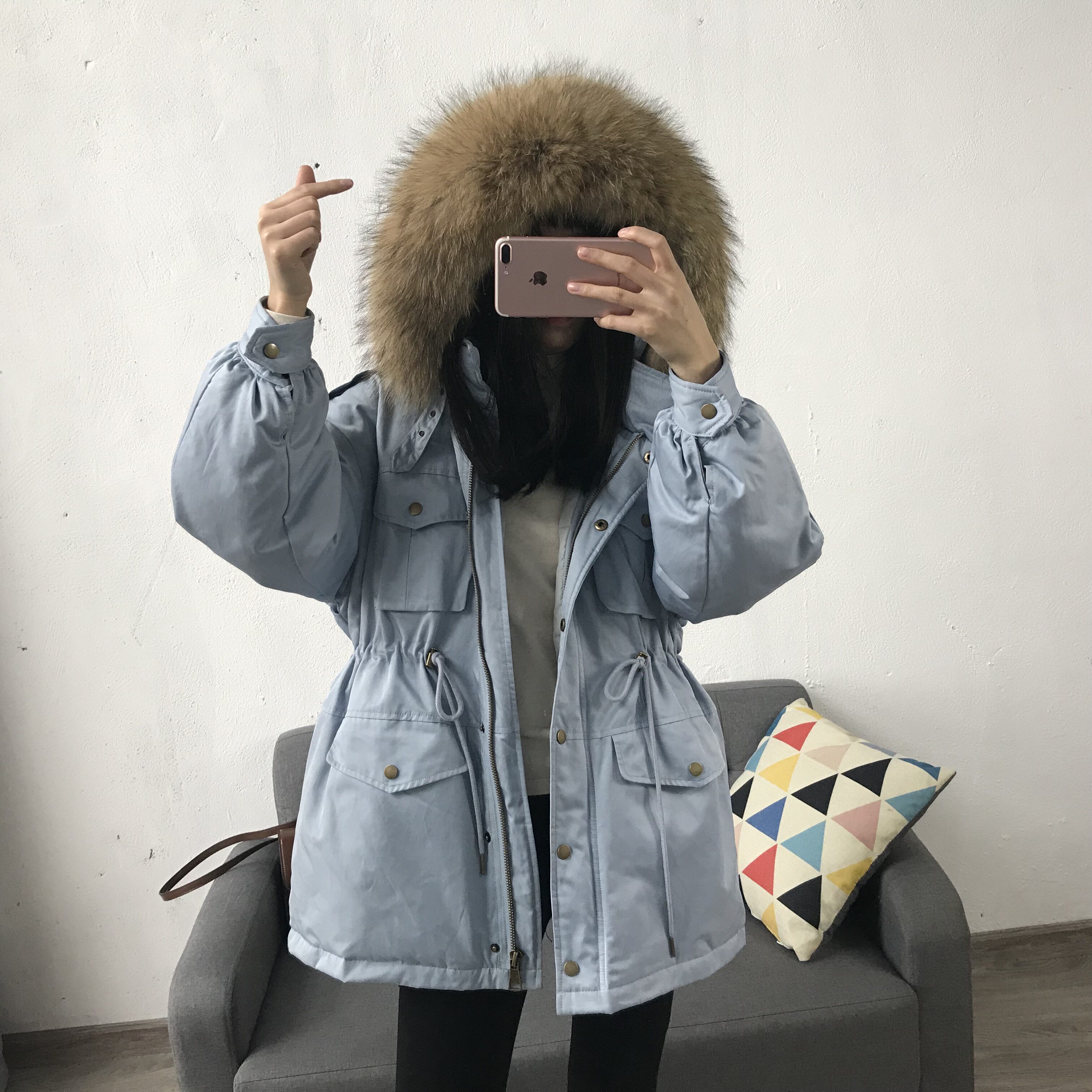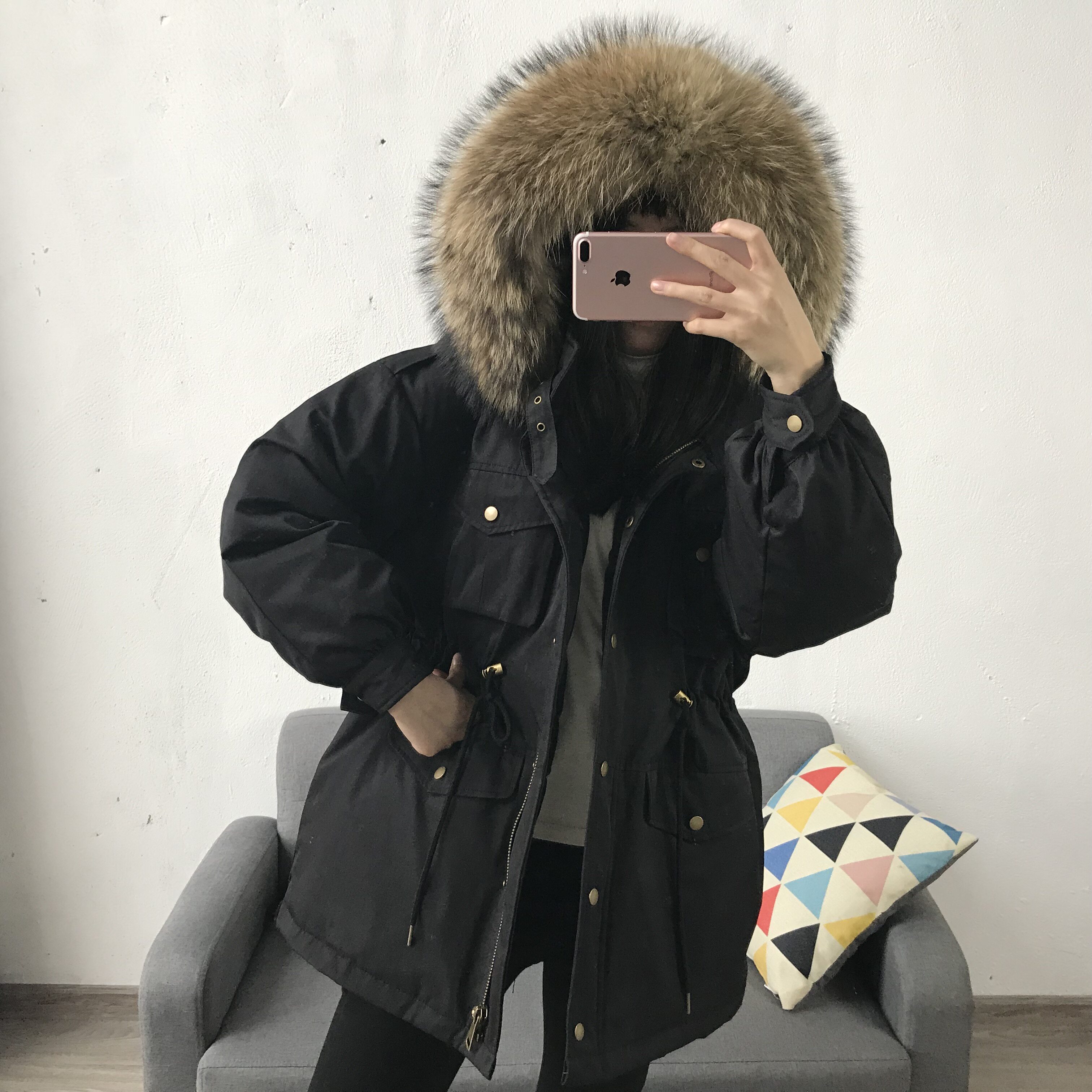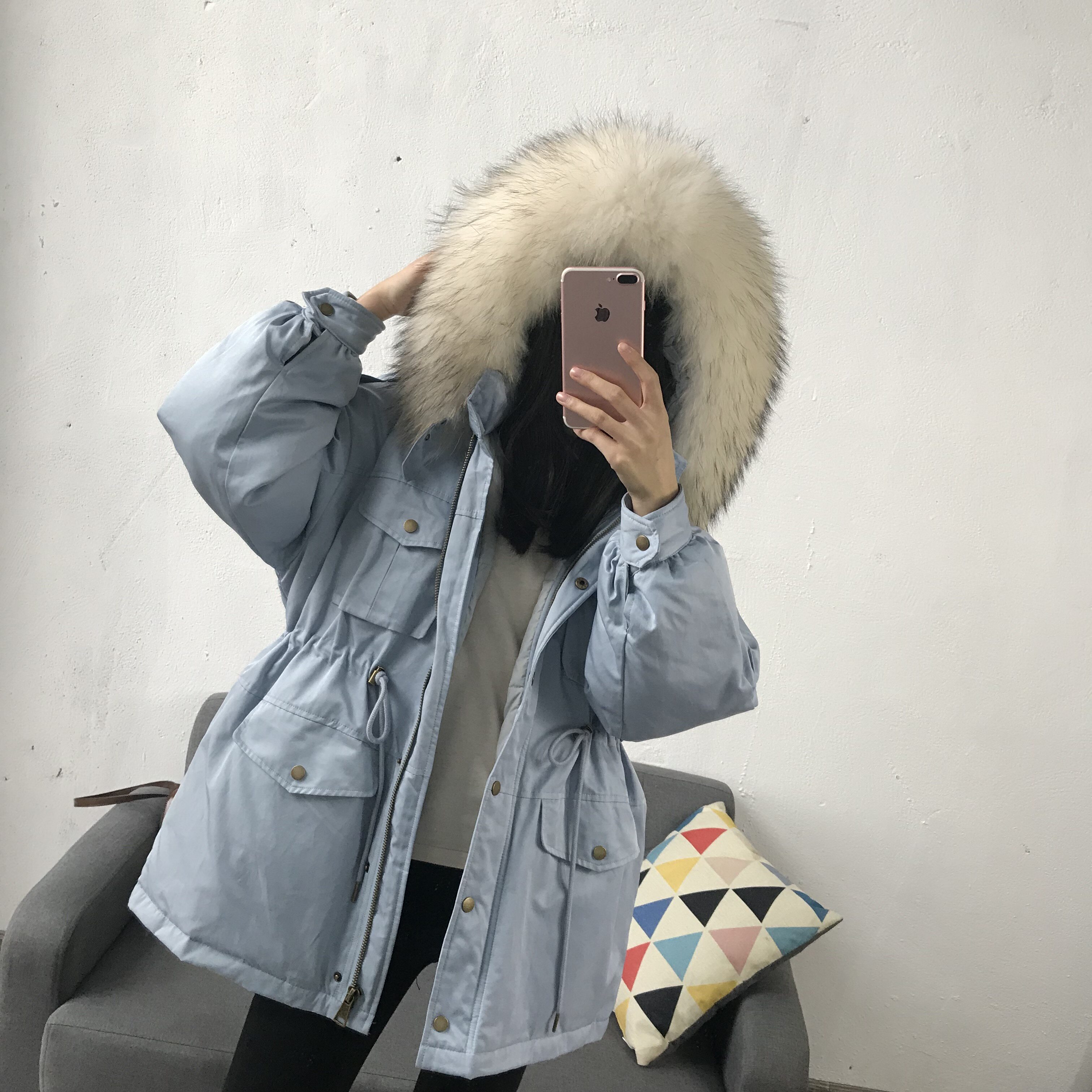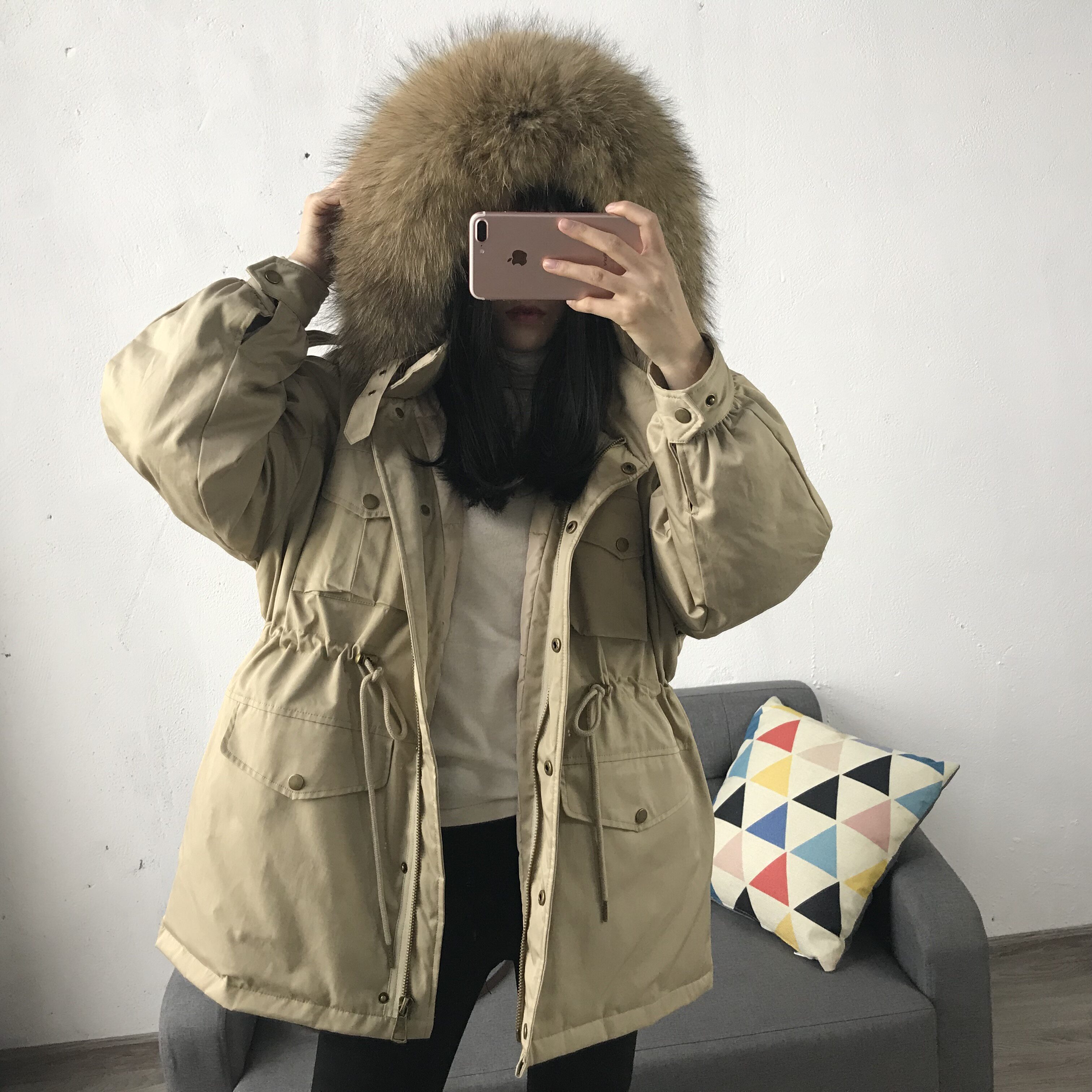 Материал:Воротник из натурального меха енота+Подкладка из белого утиного пуха= Роскошная утепленная парка