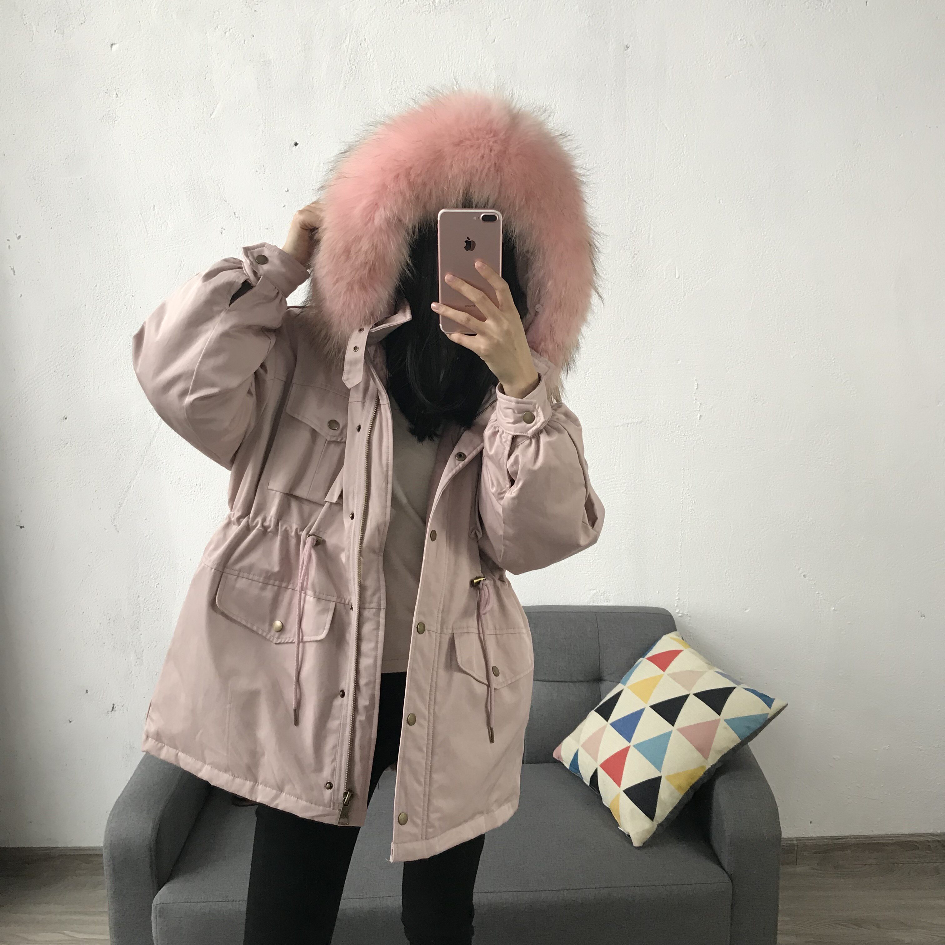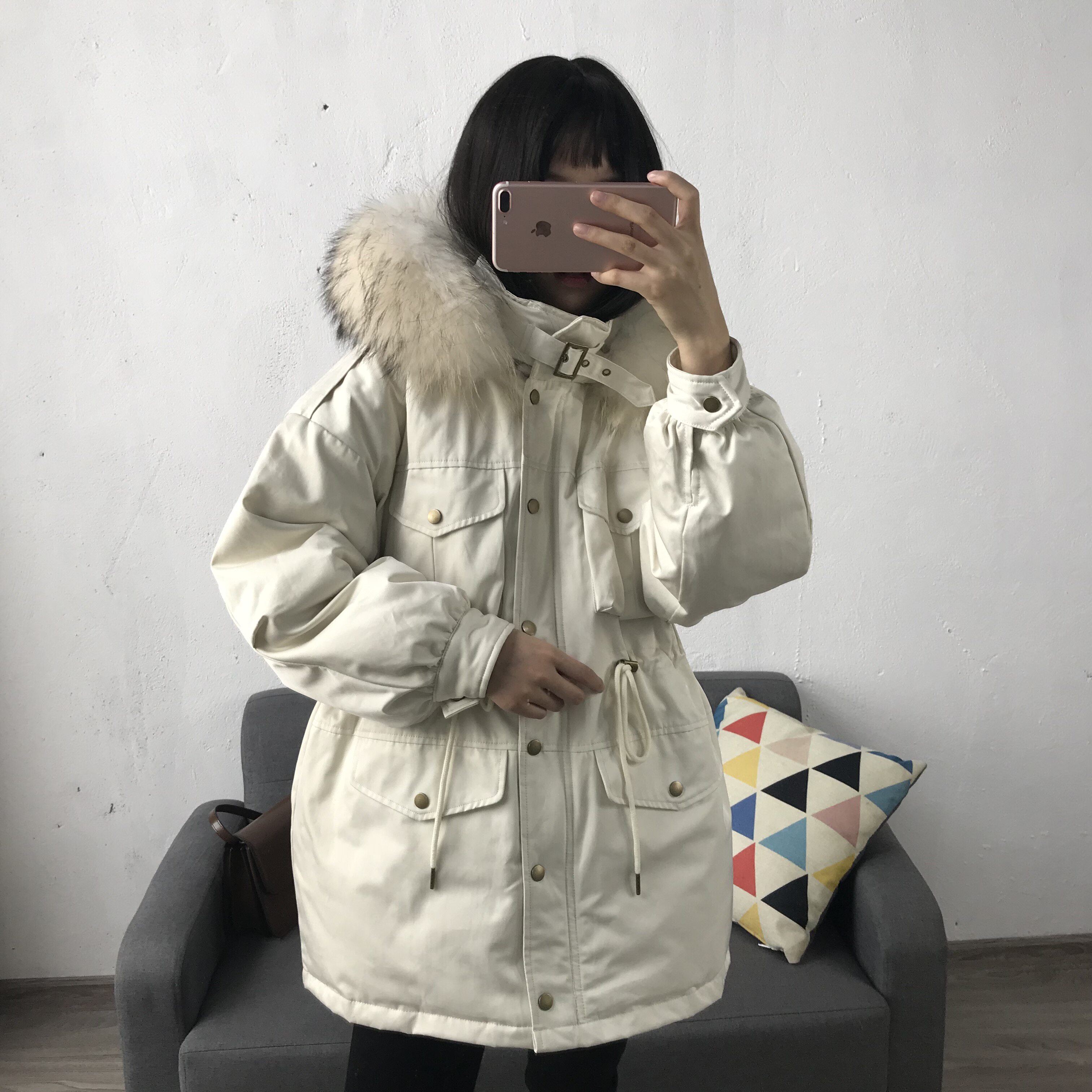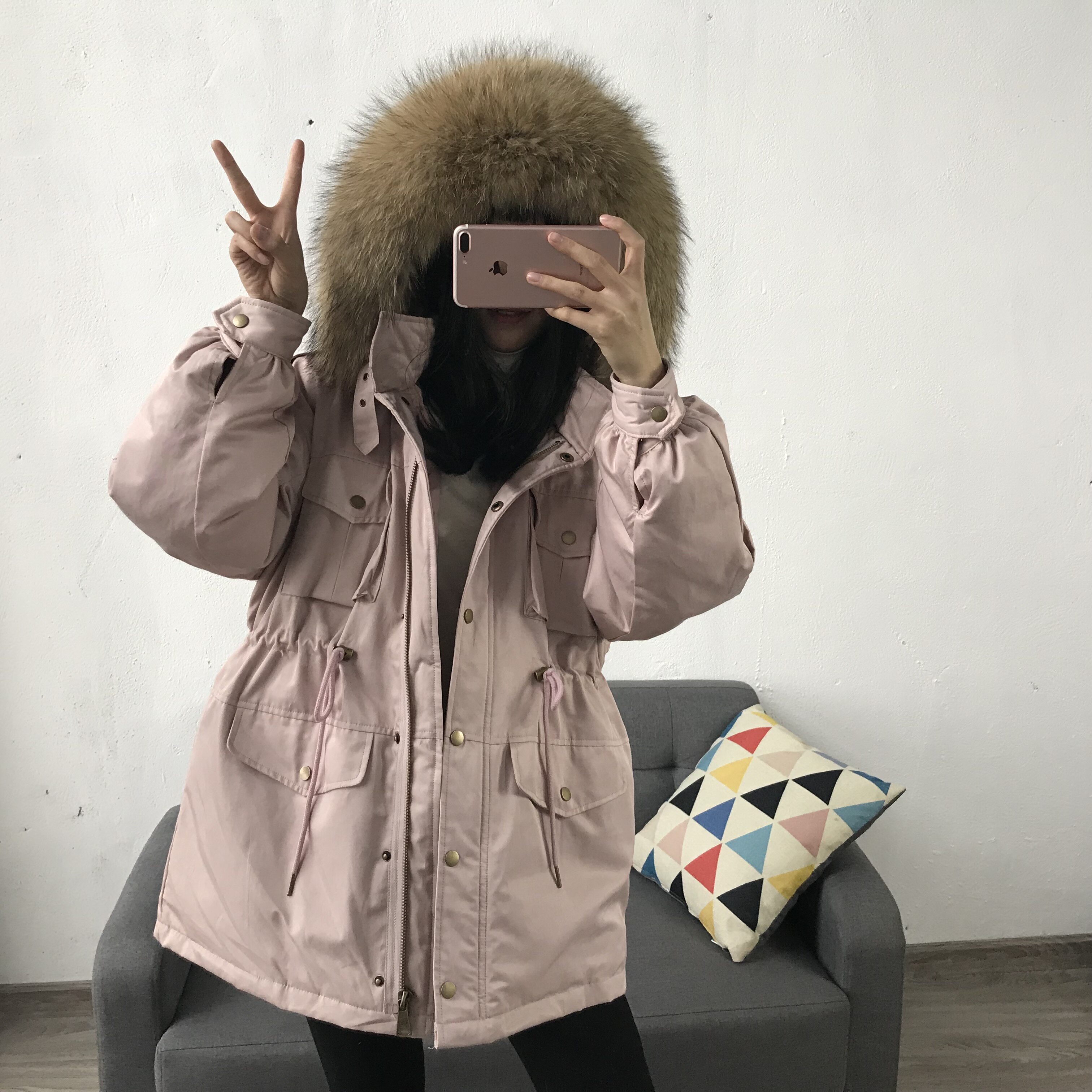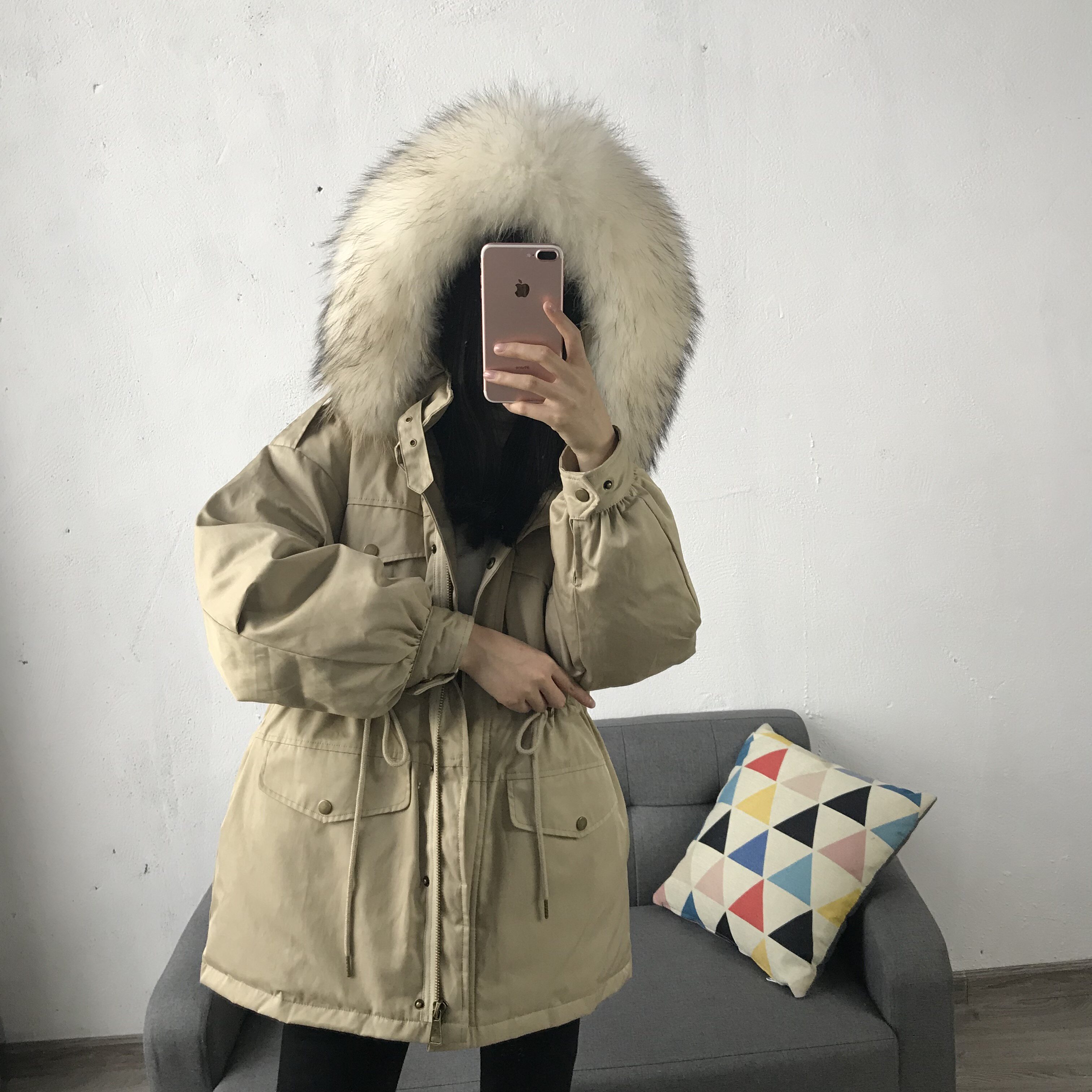 Материал:Воротник из натурального меха енота+Подкладка из белого утиного пуха= Роскошная утепленная парка