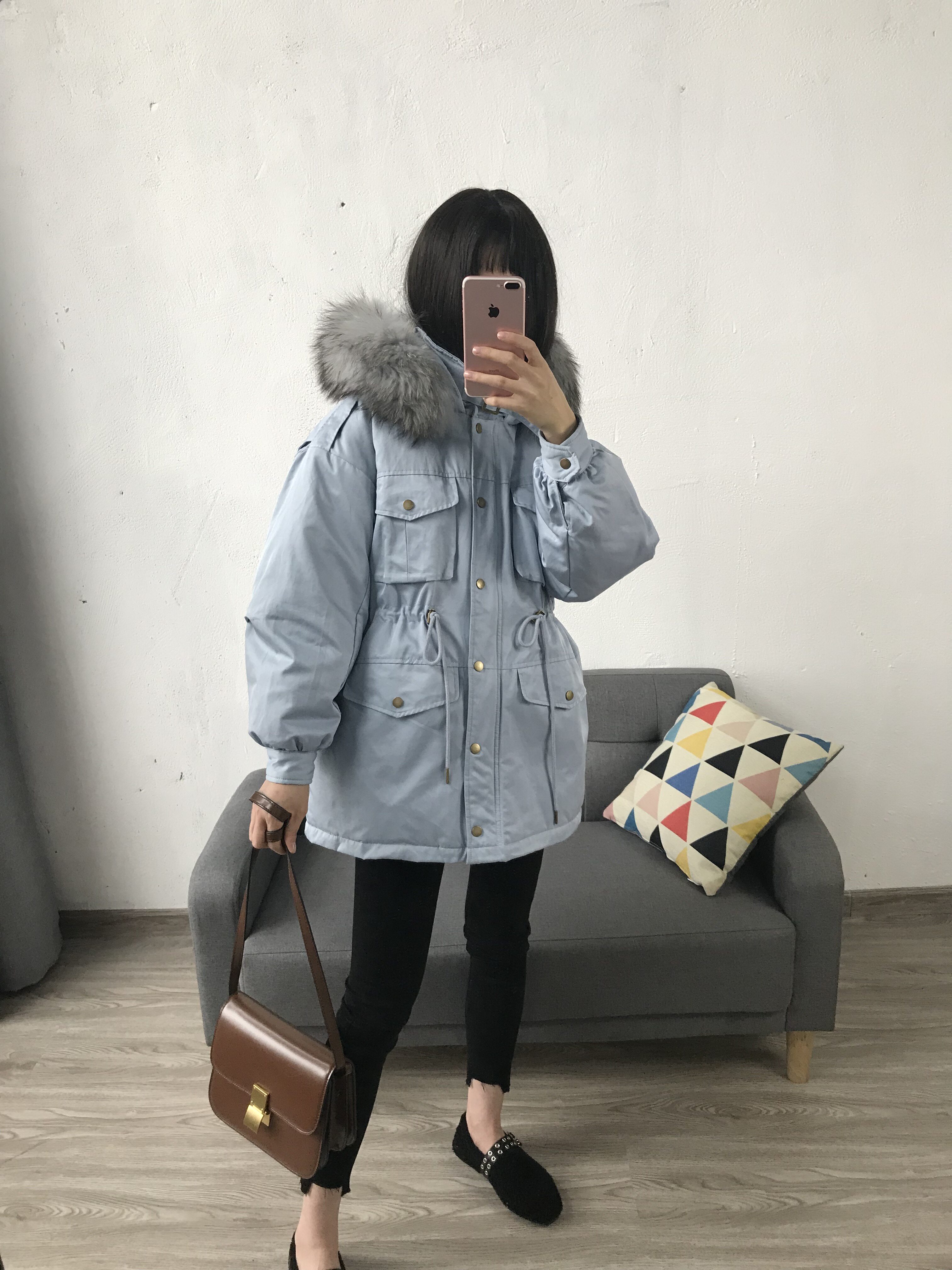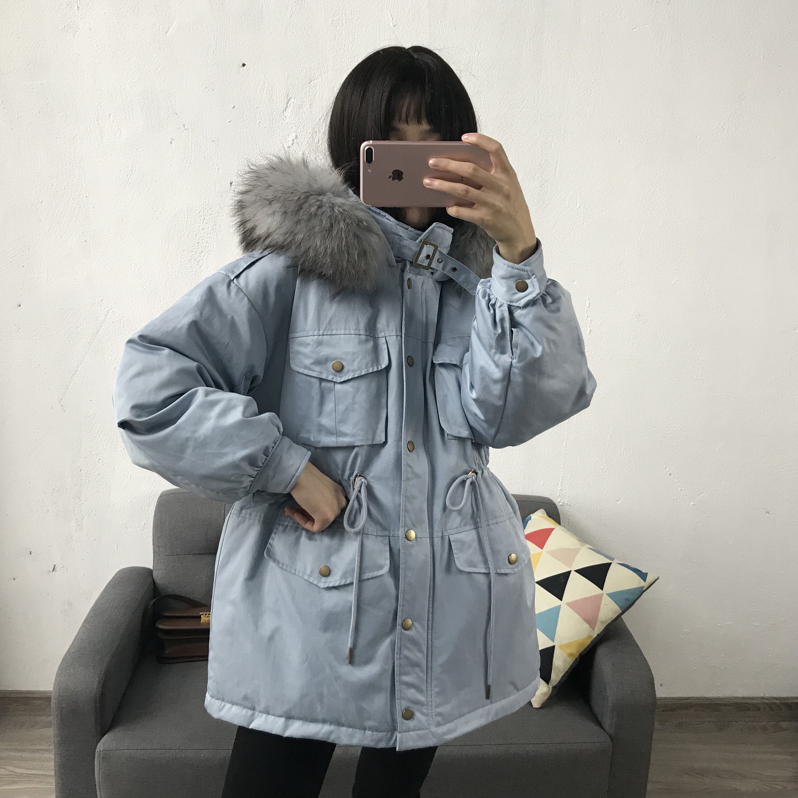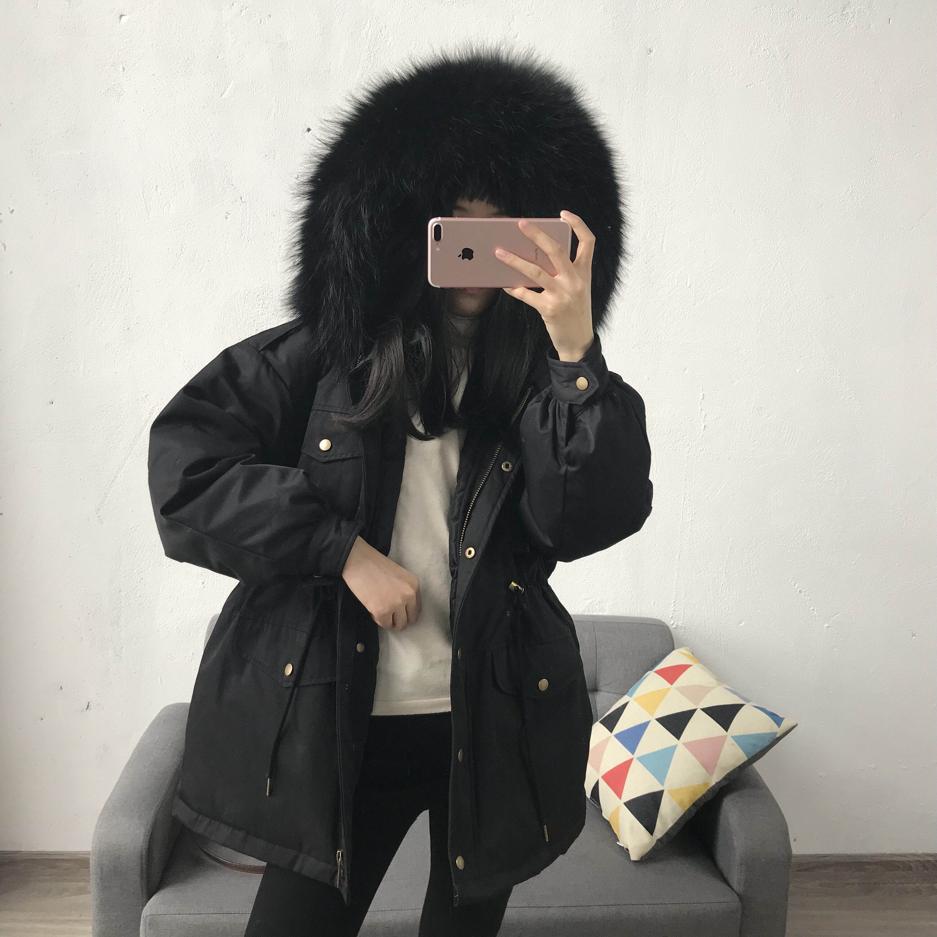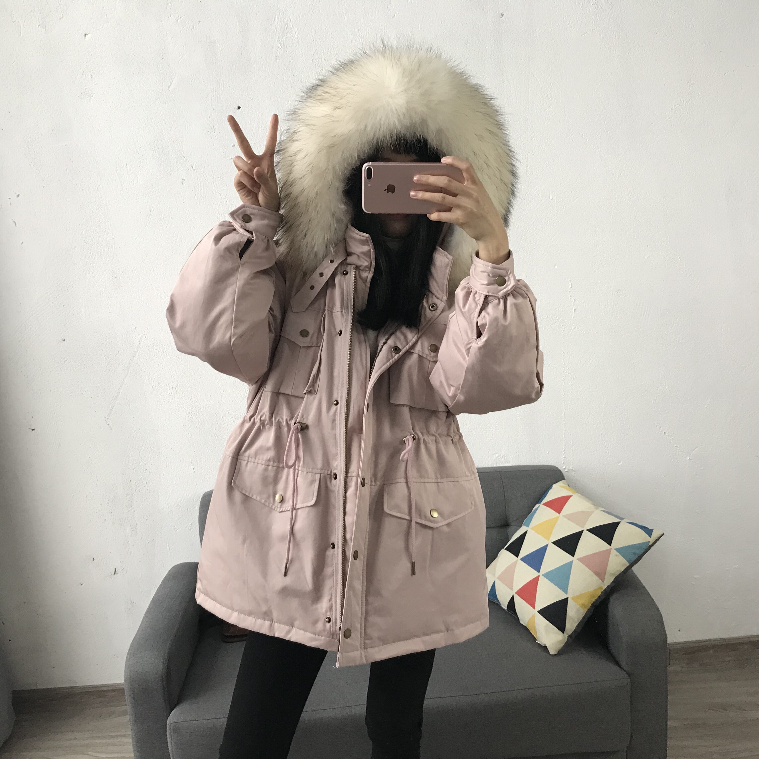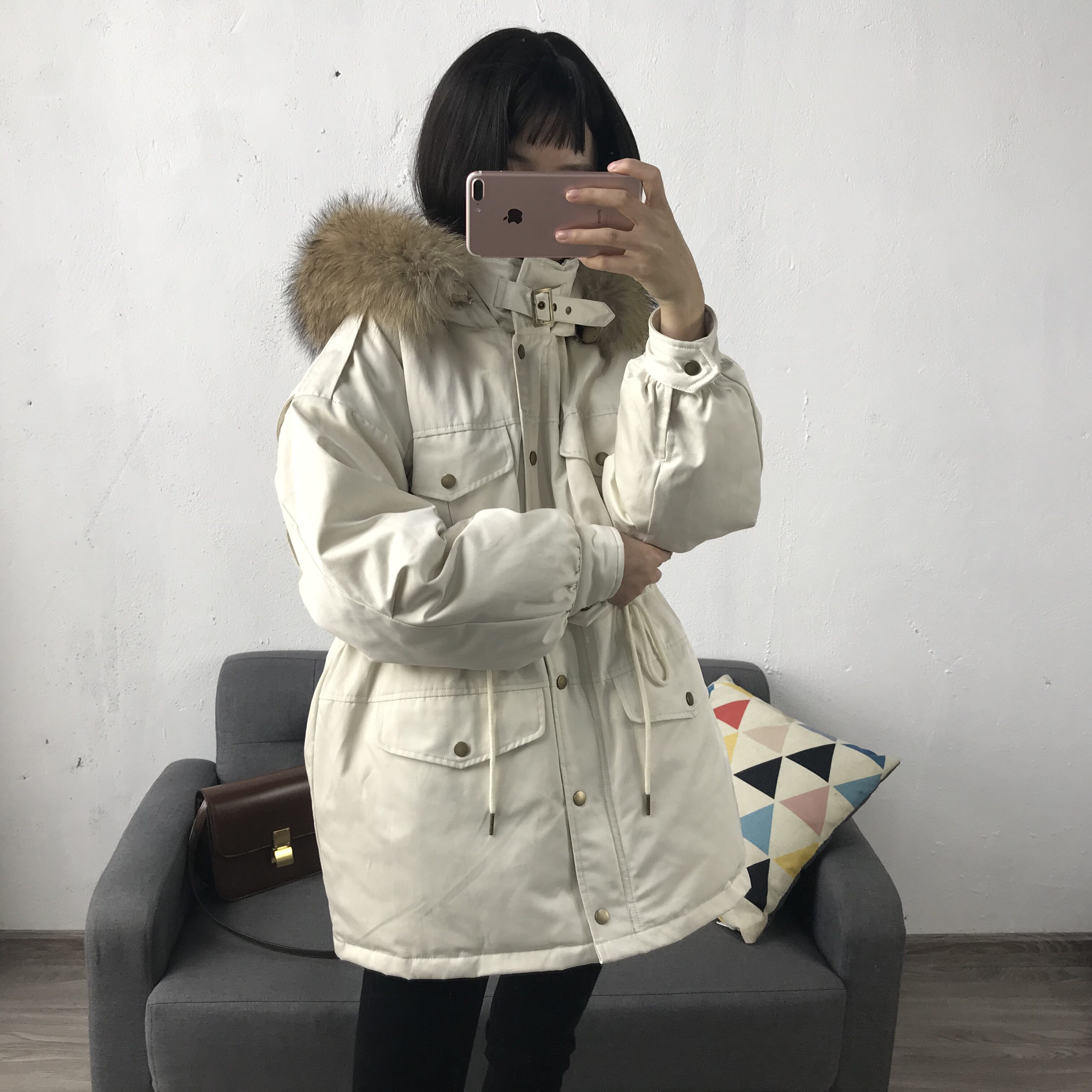 Материал:Воротник из натурального меха енота+Подкладка из белого утиного пуха= Роскошная утепленная парка