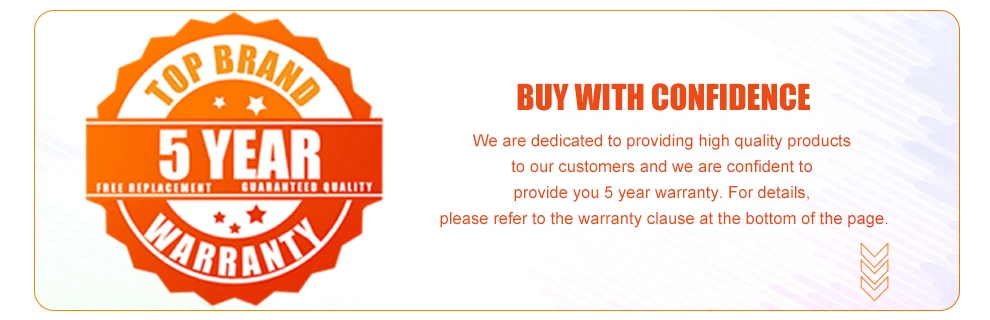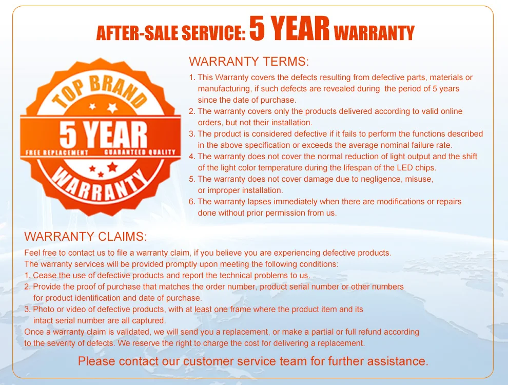 Условия Гарантии:1. Эта гарантия распространяется на дефекты, вызванные дефектами деталей, материалов или производства, если такие дефекты обнаружены в течение 5 лет с даты покупки.2. Гарантия распространяется только на товары, поставляемые в соответствии с действительными онлайн-заказами, но не на их установку.3. Продукт считается дефектным, если он не выполняет функции, описанные в вышеуказанной спецификации, или превышает средний номинальный уровень отказов.4. Гарантия не распространяется на нормальное снижение светового потока и изменение цветовой температуры света во время срока службы светодиодных чипов.5. Гарантия не покрывает повреждения из-за халатности, неправильного использования или неправильной установки.6. Гарантия немедленно теряет срок, когда есть изменения или ремонт, сделанные без предварительного разрешения от нас.Гарантийное обслуживание:Не стесняйтесь обращаться к нам для подачи гарантийного требования, если вы считаете, что у вас есть дефектные товары. Гарантийные услуги предоставляются в кратчайшие сроки после выполнения следующих условий:1. Прекратите использование дефектных продуктов и сообщите нам о технических проблемах.2. Предоставьте доказательство покупки, которое соответствует номеру заказа, серийному номеру продукта или другим номерам для идентификации продукта и дате покупки.3. Фото или видео дефектных продуктов, по крайней мере с одной рамкой, где товар и его неповрежденный серийный номер все захватываются. Как только гарантийное требование будет подтверждено, мы отправим вам замену, или сделаем частичный или полный возврат в соответствии с тяжкостью дефектов. Мы оставляем за собой право взимать плату за доставку замены. Пожалуйста, свяжитесь с нашей службой поддержки клиентов для получения дополнительной помощи.