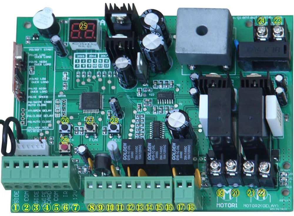 1. 2 боковых терминала используются для подключения любого внешнего устройства, которое работает с двойными воротами 2. Com-терминал широко используется для подключения внешних устройств 3. 1 боковой Терминал используется для подключения любого внешнего устройства, которое работает с одним затвором 4. Терминал карты салфетки используется для подключения любых внешних устройств, которые будут работать, чтобы открыть ворота 5. Com-терминал широко используется для подключения внешних устройств 6. Инфракрасный Терминал используется для подключения фото электрического датчика 7. Выход постоянного тока 12 В используется для подключения фотоэлектрического датчика (непрерывный выходной ток <= 200 мА) 8. Выход батареи 24 В используется для подключения резервного аккумулятора + 9. Выход батареи 24 В используется для подключения резервного аккумулятора- 10. Выход постоянного тока 24 В используется для подключения внешнего устройства. (например, фотоэлектрический датчик, максимальный выходной ток 1A) 11. GND используется для подключения внешних устройств 12. Выход лампы постоянного тока 24 В используется для подключения вспышки +. 13. Выход лампы постоянного тока 24 В используется для подключения вспышки-. 14. Выход замка постоянного тока 24 В-терминал NF, который используется для подключения электрического замка 15. COM широко используется для подключения «земли» замка 16. Выход блокировки постоянного тока 24 В-терминал NA, который используется для подключения магнитного замка 17. 24V DC выходной сигнал тревоги 18. 24V DC выходной сигнал тревоги 19. 20. Терминал Motor1 используется для подключения двигателя 1, установленного на воротах, который открывается позже и закрывается сначала. Этот терминал подключает 1-й Красный провод (отсчитывается с левой стороны на правую сторону) 21. 22. Терминал задержки двигателя 2 используется для подключения двигателя 2, установленного на воротах, которые открываются сначала и закрываются позже. Этот терминал подключает 1-й синий провод (отсчитывается с левой стороны на правую сторону). Обратите внимание! Если для одиночных ворот, двигатель ворот просто может подключить терминал задержки двигателя 2. 23. AC24V вход используется для подключения трансформатора 24. AC24V вход используется для подключения трансформатора 25 лет. Цифровой дисплей используется для отображения данных настройки 26. INC + используется для увеличения фигуры при установке данных 27. Забава используется для хранения данных 28. DEC-используется для уменьшения фигуры при установке данных 29. Кнопка обучения используется для программы/удаленного удаления Если вам нужны более четкие инструкции и инструкции по установке, пожалуйста, свяжитесь с продавцом для использования E-mail отправить E-mail: kingjoin83@sina.com