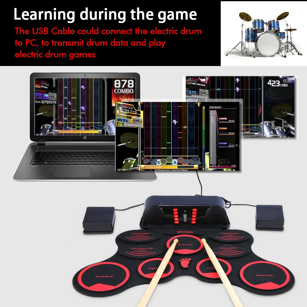 【Легко и весело играть 】Поддерживает функцию MIDI, вы можете передавать данные барабана на компьютер и играть в электрические барабанные игры; Встроенный 3 стиля барабанного тона, 9 демонстрационных песен и 10 ритмов, которые сделают вашу тренировку проще; набор электронных барабанов-отличный Музыкальный обучающий инструмент для ваших маленьких детей.