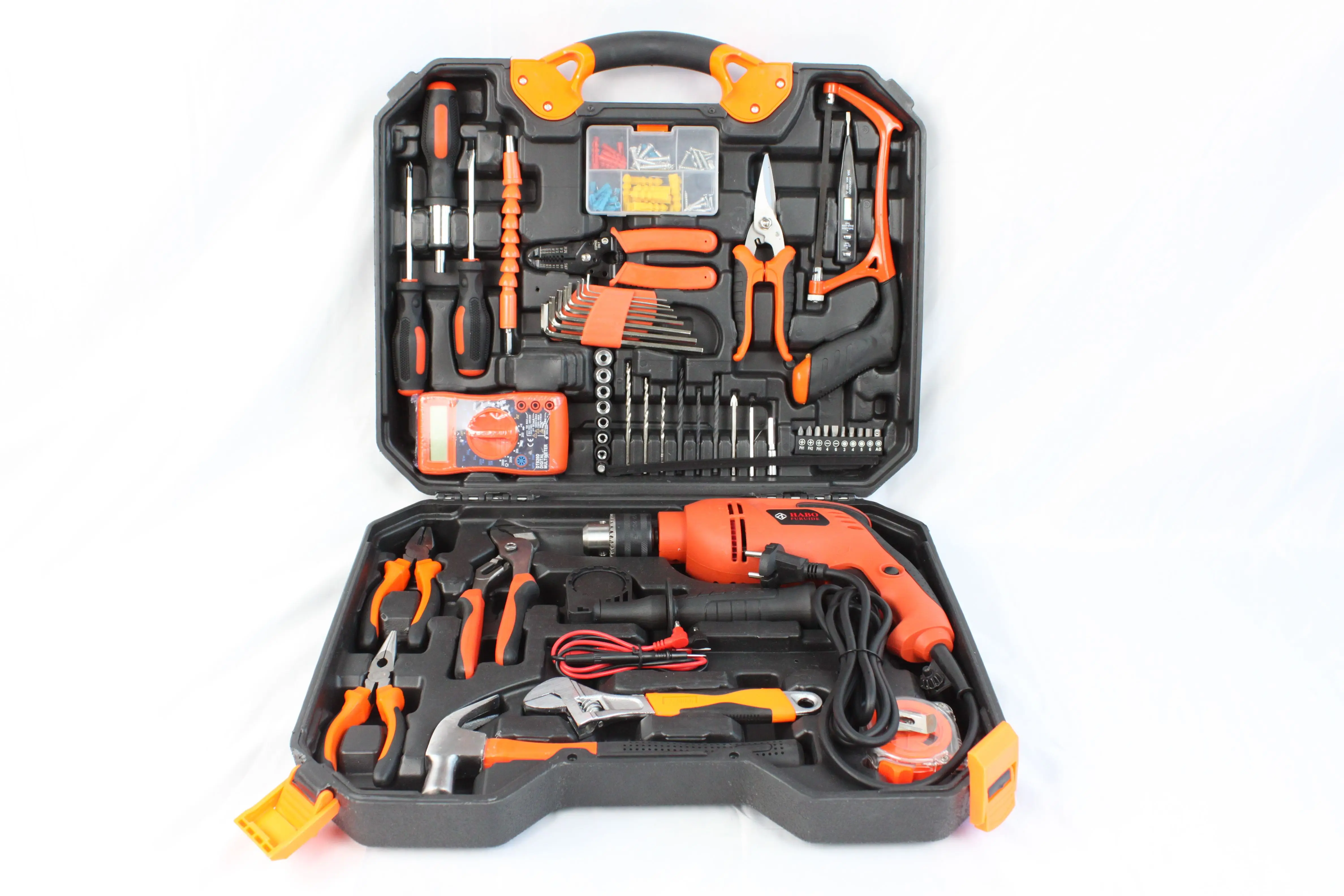 1. Храповая ручка 2. Универсальный гибкий вал 3. Набор Расширительных трубок 4. Отвертка Word 5. Отвертка Phillips 6. Набор внутренних шести гаечных ключей 7. Цифровой мультиметр 8,7 дюйма воды ртути зажим 9,6 дюймов кусачки 10,6 дюймов Иглогубцы 11. Волоконная ручка молоток 12. Золотая пила из алюминиевой коробки 13. Электрическая ручка с цифровым дисплеем 14. Универсальные ножницы электрика 15. Зачистки электрических проводов 16. Высокая-конец нож бытовой 17. Комбинированная розетка 18. Комбинация головки отвертки 19. Мощное строительное сверло, сверло из быстрорежущей стали, сверло для плитки Ударная дрель 20,13 мм 21. Уровень алюминиевого сплава 22,8 дюймовый Регулируемый ключ 23,5 м Рулетка