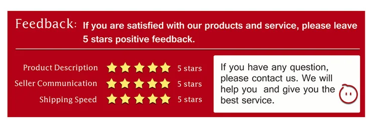 Если ваш заказ был успешно доставлен и вы довольны товаром, пожалуйста, нажмите «подтвердить получение заказа» и оставьте положительотзывы в с 5 звездами. Ваш положительный отзывы в очень вдохновляет меня. Мы предоставим вам большую скидку на ваш следующий заказ. Если у вас возникнут какие-либо проблемы, пожалуйста, сначала свяжитесь со мной, пожалуйста, не оставляйте плохой отзыв, он не может быть изменен, пожалуйста, свяжитесь с нами, мы сделаем все возможное, чтобы помочь вам, пожалуйста, не волнуйтесь, заранее спасибо.