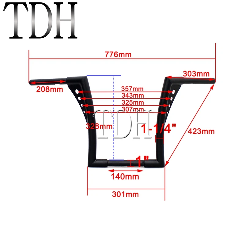 12 "подъем. 8 "Обратная развертка. 1 1/4 "-диаметр. Центральная секция и кончики конусны до 1 ", так что стандартный Руль управления подходит.