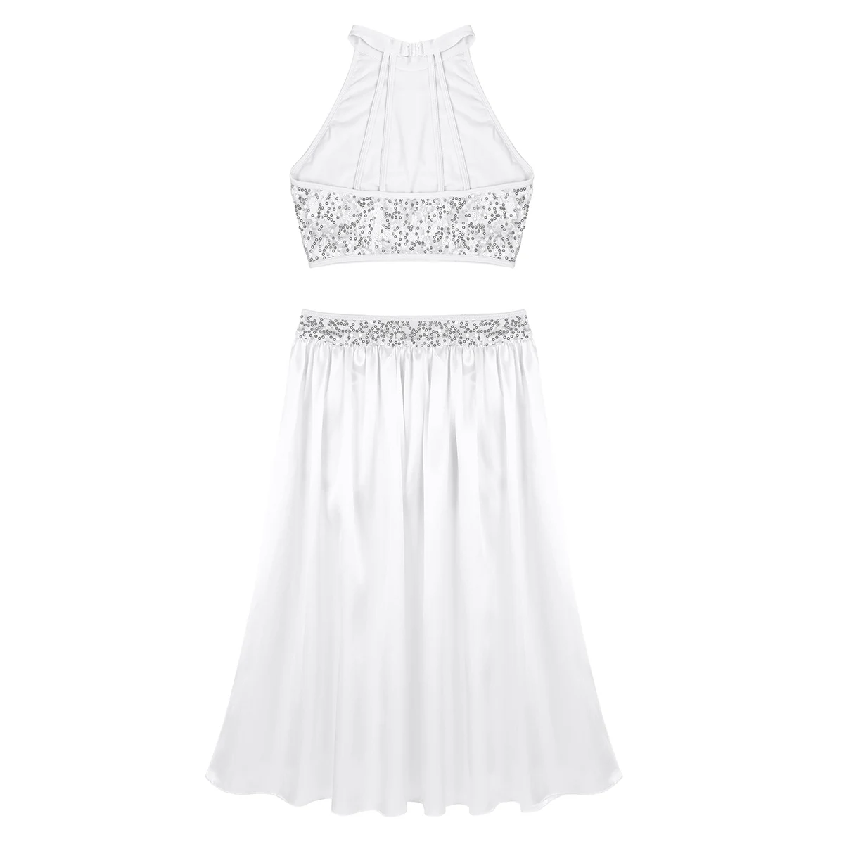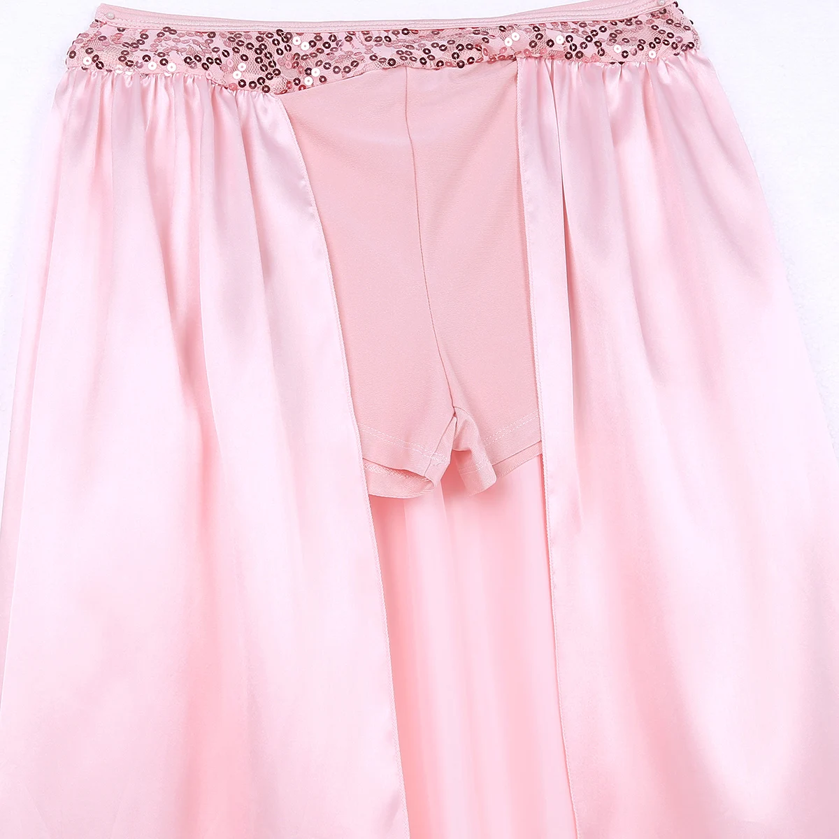 Короткий топ с блестками и вырезом на шее; Открытая юбка длиной до середины икры; шорты трико.