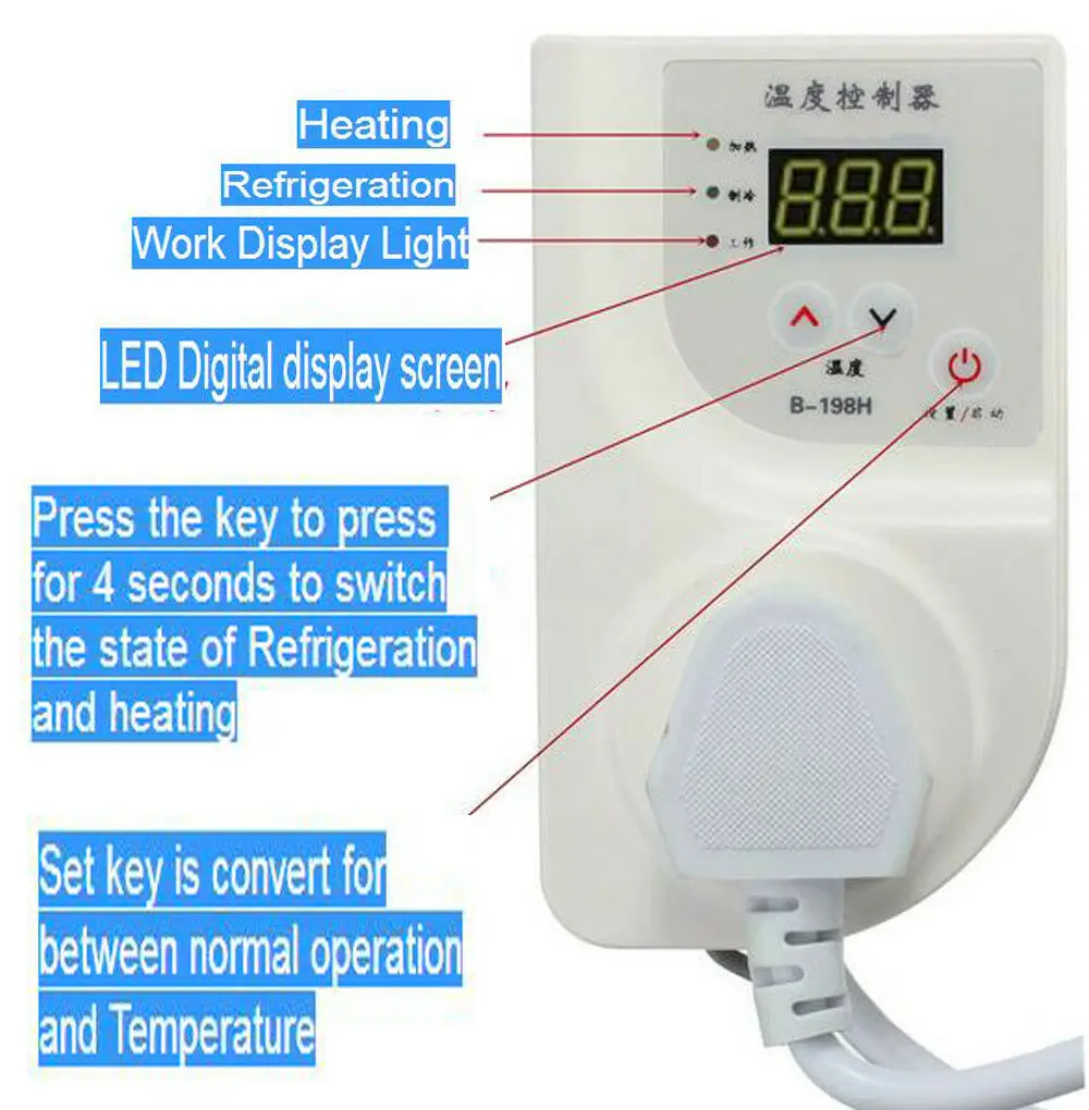 100% абсолютно новый и качественный. Технические параметры: Мощность: 50 Гц ac220в Максимальная мощность нагрузки: 2000 Вт Рабочая температура контроля температуры: 0 ~ 40 ℃ Диапазон измерения температуры: -35 ~ 55 ℃ Диапазон контроля температуры охлаждения: -30 ~ 38 ℃ Диапазон теплового контроля: + 5 ~ 45 ℃ Разница в возврате: ± 1 ℃ Точность температуры: ± 1 ℃ Точность обмена датчика: R:10K Ω ± 1% , B:3470 ± 1% Длина зонда 2,5 метров. Размеры: 11,5x6,5x2,6 см (Д x Ш x В) Инструкции по эксплуатации 1, мощность Контроллер подключен к источнику питания, контроль температуры Устройство само проверяется, цифровая трубка заполнена, световой светильник яркий. Заводское значение по умолчанию 25, Установочное значение 5 и Рабочее состояние нагревается. 2, светильник индикатора желтый светильник на панели сказал, что режим нагрева, зеленый Светильник означает, что режим охлаждения, красный светильник означает, что нагревание или Холодильная работа, красный светильник означает, что температура тока Достиг установленных температурных требований. 3, Температура установка -Клавиша настройки: Переключение между нормальной работой и настройкой температуры. -Клавиша вверх: используется для повышения температуры. -Кнопка Вниз: используется для снижения температуры установки. Рабочий режим: Охлаждение: когда температура контроля больше или равна набору Температура + 1 град С, включите источник питания нагрузки; Когда Температура меньше или равна контрольному набору температуры-1 град С, Отключите источник питания нагрузки. Нагрев: когда температура контроля больше или равна набору Температура + 1 град С, отключите источник питания нагрузки; Когда Температура меньше или равна контрольному набору температуры-1 град С, Включите источник питания нагрузки. С защитой от замыкания: Когда датчик короткое замыкание, цифровой дисплей [dd], введите режим работы неисправности, режим выхода из строя после того, как датчик вернется в норму; Когда датчик находится в разомкнутой цепи, цифровой дисплей [---], введите режим работы с неисправностью, режим выхода из строя, режим ioperation mmediately после того, как датчик вернется в норму; Режим работы при неисправности: работает 10 минут, останавливается 20 минут, поэтому цикл Функция памяти выключения питания: Когда мощность восстановлена, запуск последнего контроллера памяти установите температуру. Посылка включает в себя: 1xDigital регулятор температуры