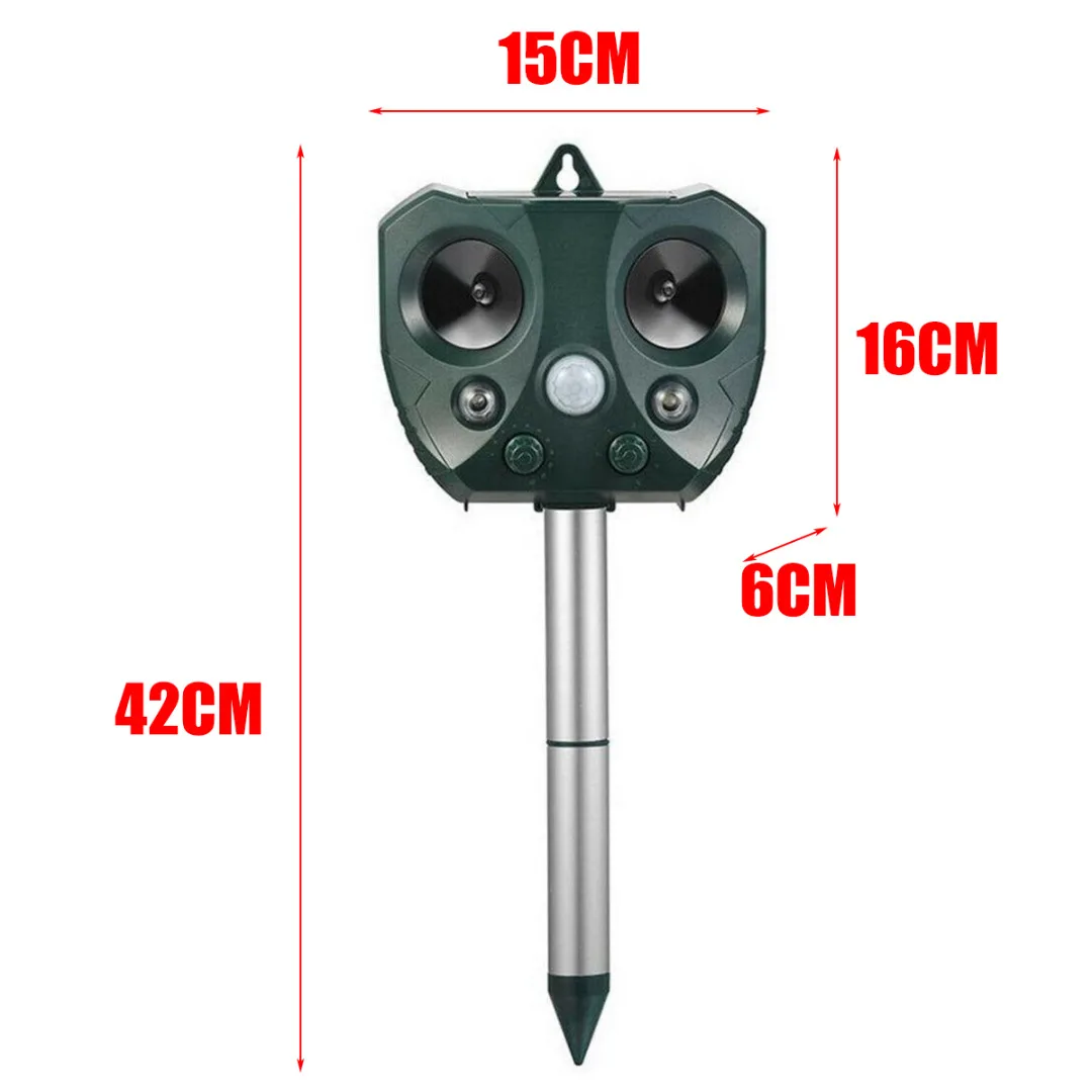 Мощный ультразвук удаляет животных. Когда животное входит в область, срабатывает инфракрасный датчик, и продукт излучает ультразвуковые волны, которые делают животное неудобным и покидает область.