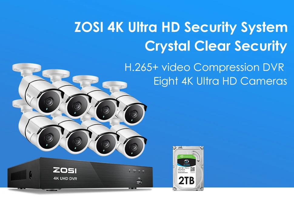 (1).4K Ultra HD 8 канальная система безопасности (2).Расширенный H. 265+ высокая эффективность сжатия видео (3).Удаленный доступ и обнаружение движения (4).Настройка каждой камеры с различными режимами записи (5).Алюминиевый корпус, повышенная защита от влаги. (6).Повышенная четкость с помощью 3D-DNR (7) Безопасное локальное хранилище с жестким диском Seagate емкостью 2 ТБ