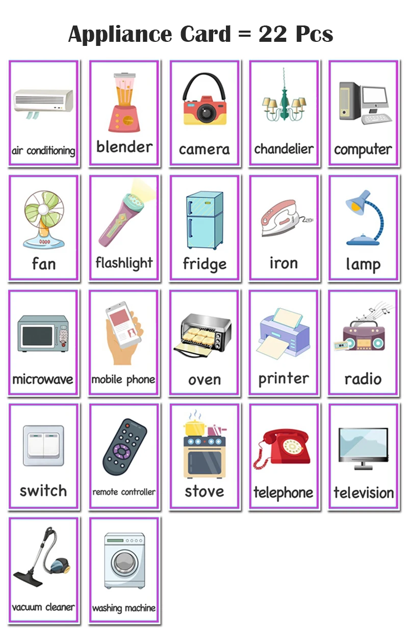 Материал: Водонепроницаемый, анти-складной и обработка филе без царапин Размер: 80 мм * 110 мм Карта прибора = 22 шт. Мебельная карта = 24 шт. Особенности: 1. Английская карта может улучшить познавательные способности ребенка, чтобы улучшить память детей. 2. Это съемка для реального изображения, HD изображения, более прямого и четкого слова. Детям будут интересны эти английские карточки. 3. Это может помочь детям быстро запоминать слова, накапливать больше знаний о Слове и овладевать английскими навыками, является лучшим и важным инструментом для обучения английскому языку.