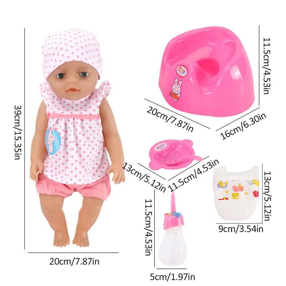Размер изделия: прибл. Кукла 39*20 см/15,35 дюйма, Туалет: 20*16*11,5 см/7,87*6,30*4,53 дюйма, подгузник 13*9 см/5,12*3,54 дюйма
