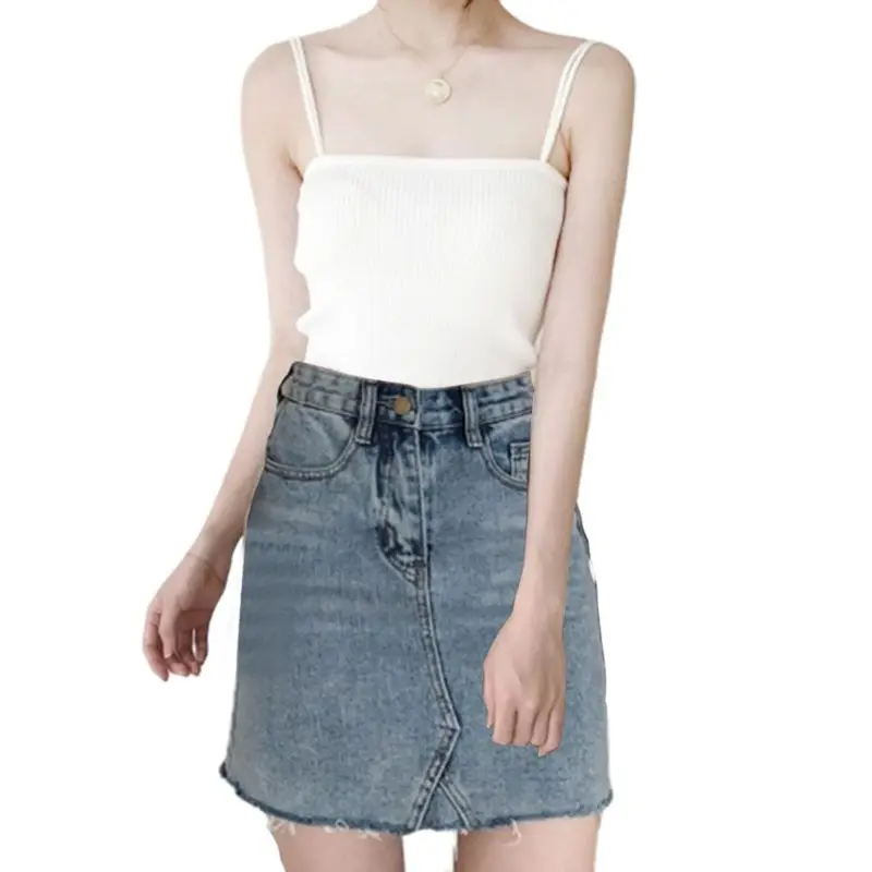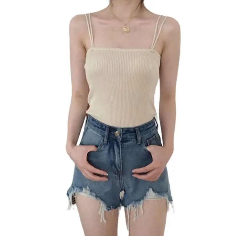 Корейский минималистский женский ребристый вязаный жилет без рукавов с двойными бретельками однотонный Повседневный тонкий топ на бретелях