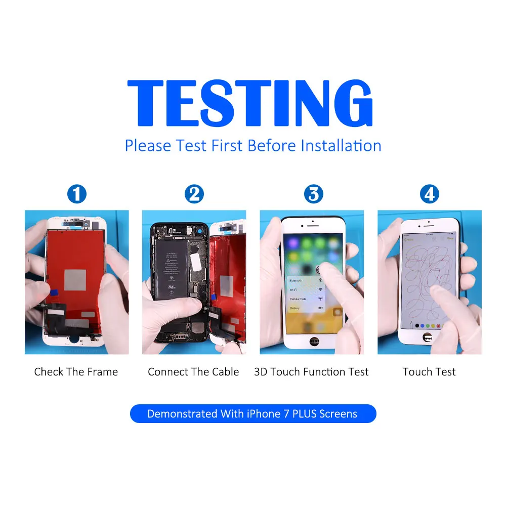 1. Детали: внешнее стекло + ЖК-экран + сенсорная панель дигитайзера + Переднее кольцо для камеры + Датчик-светильник + Пыленепроницаемая сетка для ушей, предварительно собранная. 2. Подходит для iPhone 7/7P/8/8P 3. Контроль качества: Каждый экран был протестирован перед отправкой и работает на 100%. 4. Посылка: поставляется с антистатической сумкой + пузырчатой сумкой, безопасной упаковкой. 5. Гарантия: мы предлагаем гарантию на 6 месяцев (гарантия аннулируется, если ЖК-дисплей/гибкий кабель/Рама повреждена после установки или во время установки).