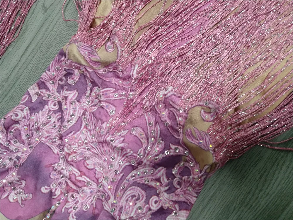 Сексуальные розовые стразы с кисточками, сценический комбинезон для женщин, для ночного клуба, с кристаллами, стрейчевое Боди для танцев на шесте, трико для шоу, одежда для сцены
