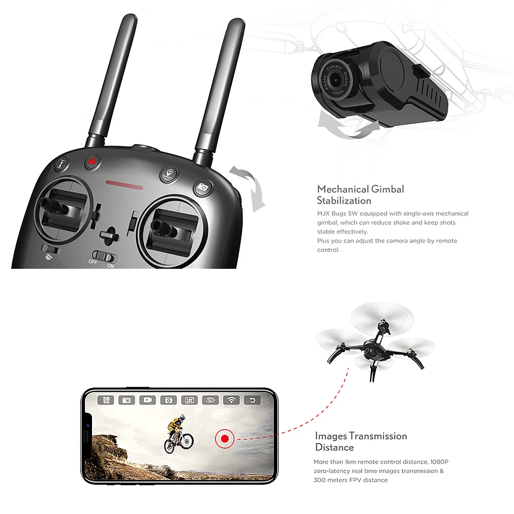 MJX Bugs новый член семьи: 5 W! Супер крутой Дрон, который является именно начинающим дроном, который вам нужен. С особенным внешним видом, вам понравится с первого взгляда. Эта версия включает в себя 1080 P 5G WiFi HD камера, дающая вам впечатляющий опыт фотографирования от thesky!