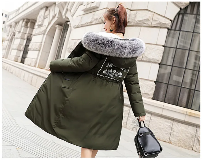 Женская зимняя новая одежда пуховая хлопковая куртка Большие размеры; Свободное пальто средней длины; теплое плотное пальто Элегантная тонкая женская куртка с двойным меховым воротником с капюшоном Длинная Куртка 279