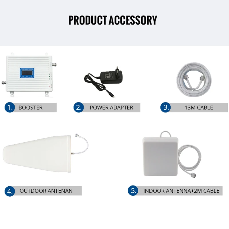 1. GSM 900 1800 3G 2100 повторитель x1 2. Мощность переменного тока Cordx1 3. LPD наружная антенна x1 4. Панель внутренней антенны x1 Кабель 5,13 м 1