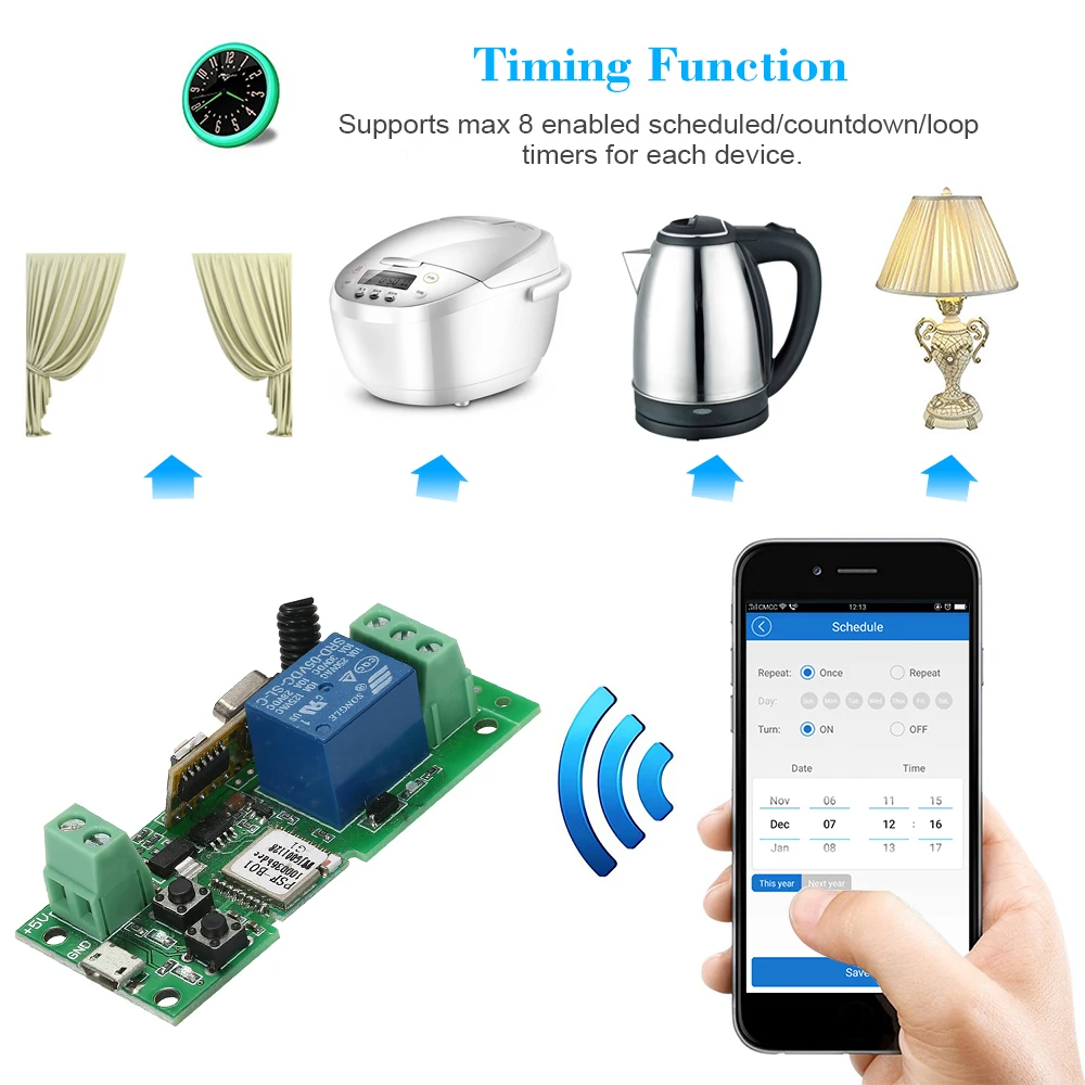 Этот беспроводной коммутатор является недорогим и доступным устройством, которое позволяет пользователям удаленно включать/выключать подключенное устройство различных типов и брендов через приложение EWeLink из любой точки мира в любое время, И установив графики для ваших приборов, вы можете поддерживать беззаботную жизнь. Он интегрируется с модулем радиочастотного приемника 433 МГц, поэтому переключатель WIFI может управляться дистанционным управлением RF внутри помещения. Он поддерживает режим инчинга/самоблокировки. В режиме самоблокировки клиенты могут удаленно включать/выключать подключенные устройства немедленно. В режиме инчинга клиенты могут выбрать два способа подключения: включить 1s, а затем автоматическое выключение, выключить 1s, а затем автоматическое включение.
